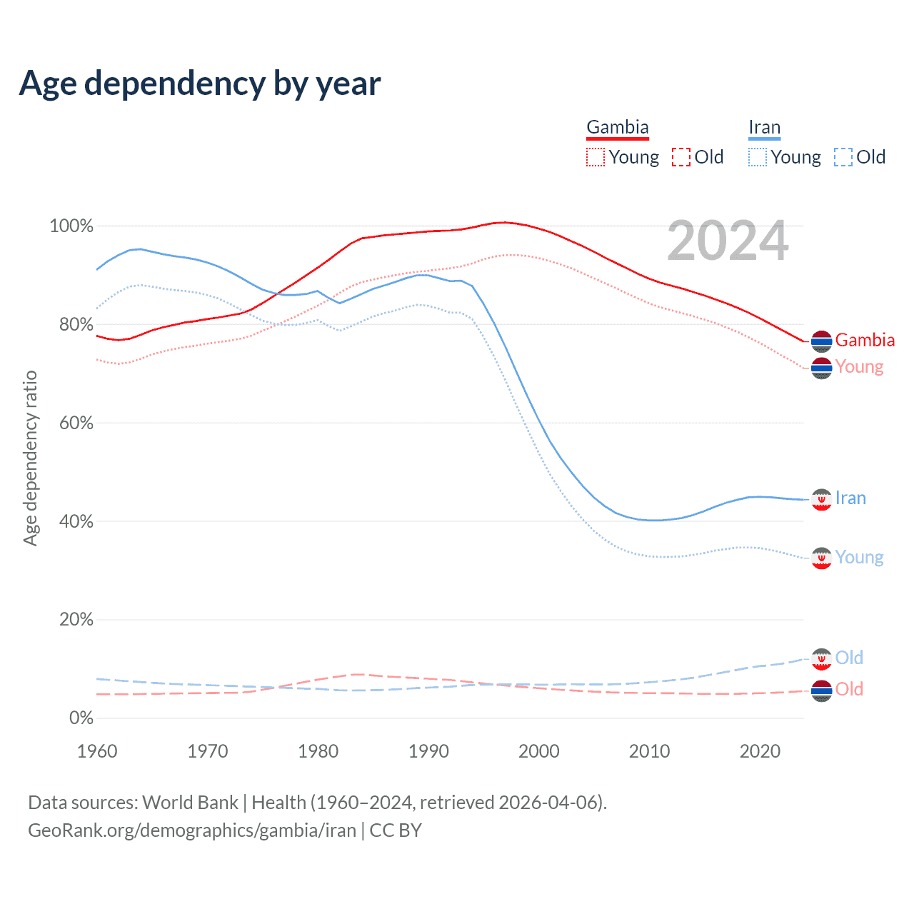 - The share of old-age demographic (65+) in the Gambia is 3.08% vs 8.24% in Iran.
