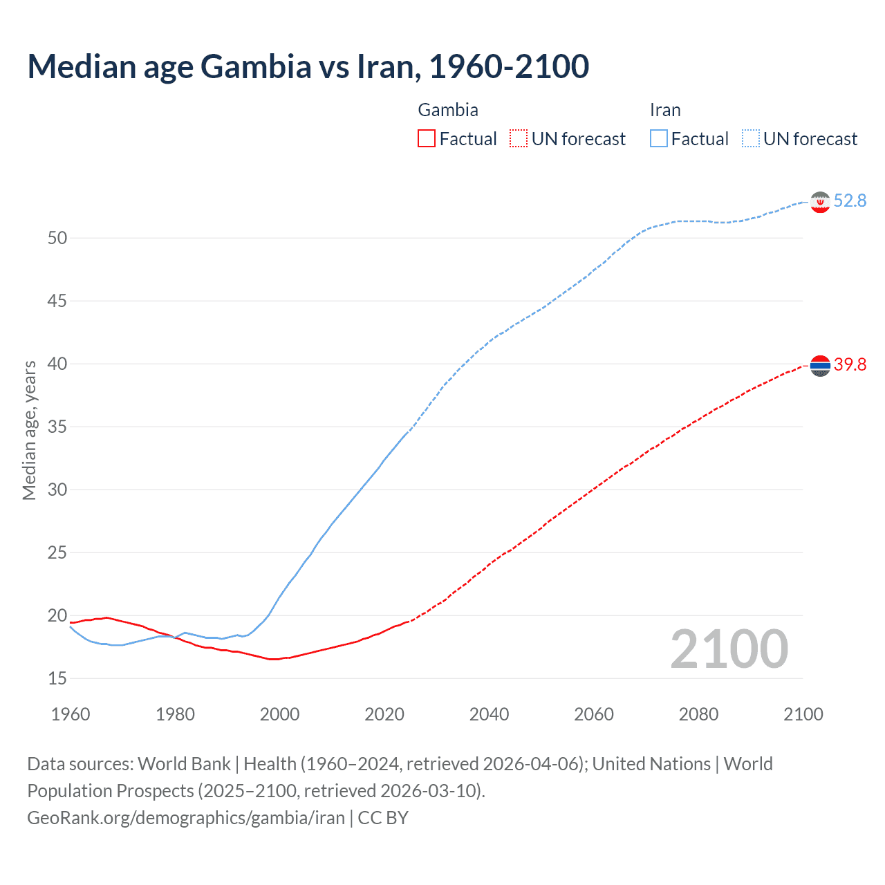 - The Gambia is ranked 171/196 by median age (oldest to youngest) vs 79/196 for Iran.