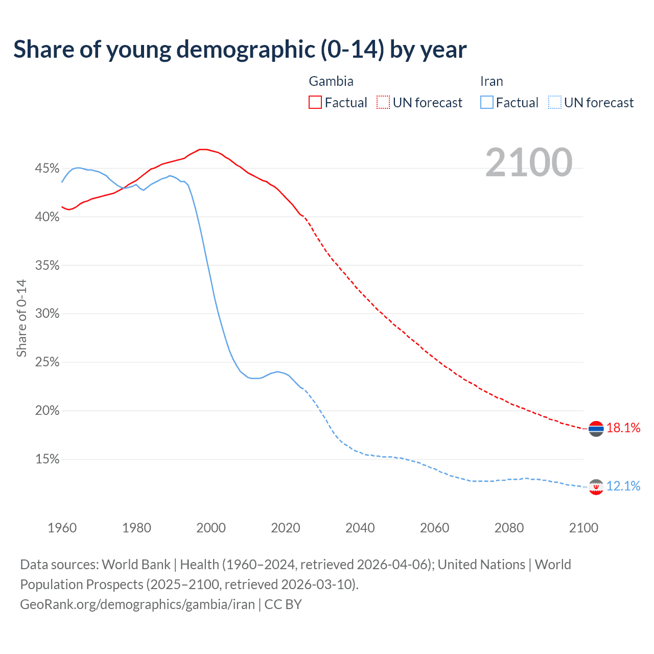 - The share of young demographic (0-15 years old) in the Gambia is 40.2% vs 22.4% in Iran.