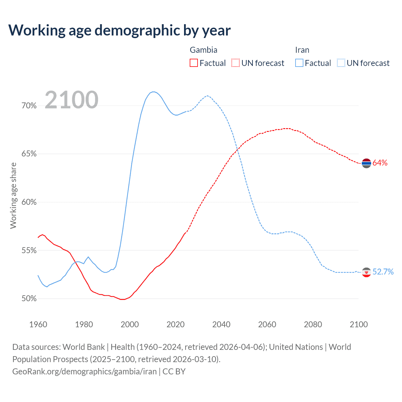 - The Gambia has 1.64M working age adults (aged 15-64) vs 64.8M in Iran.