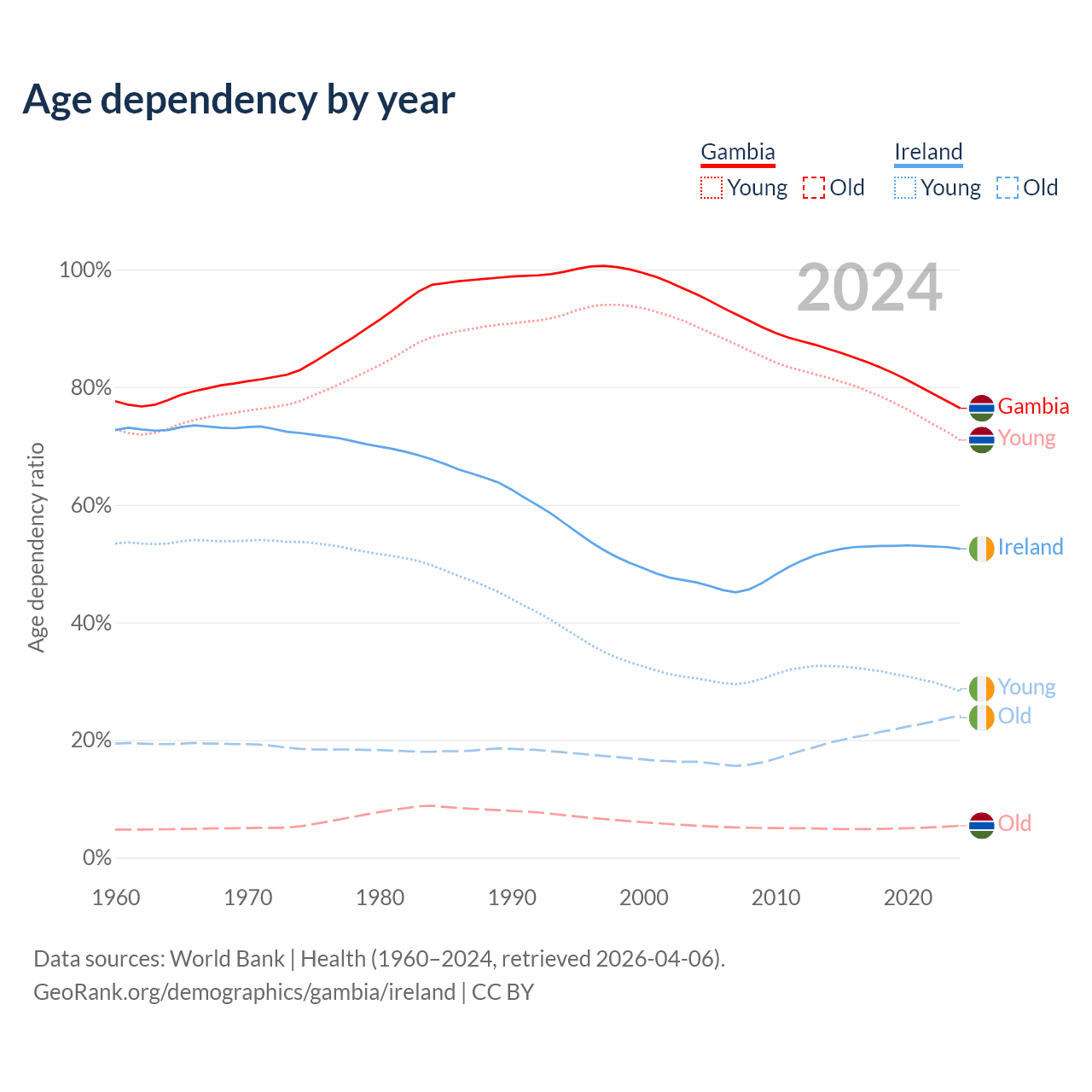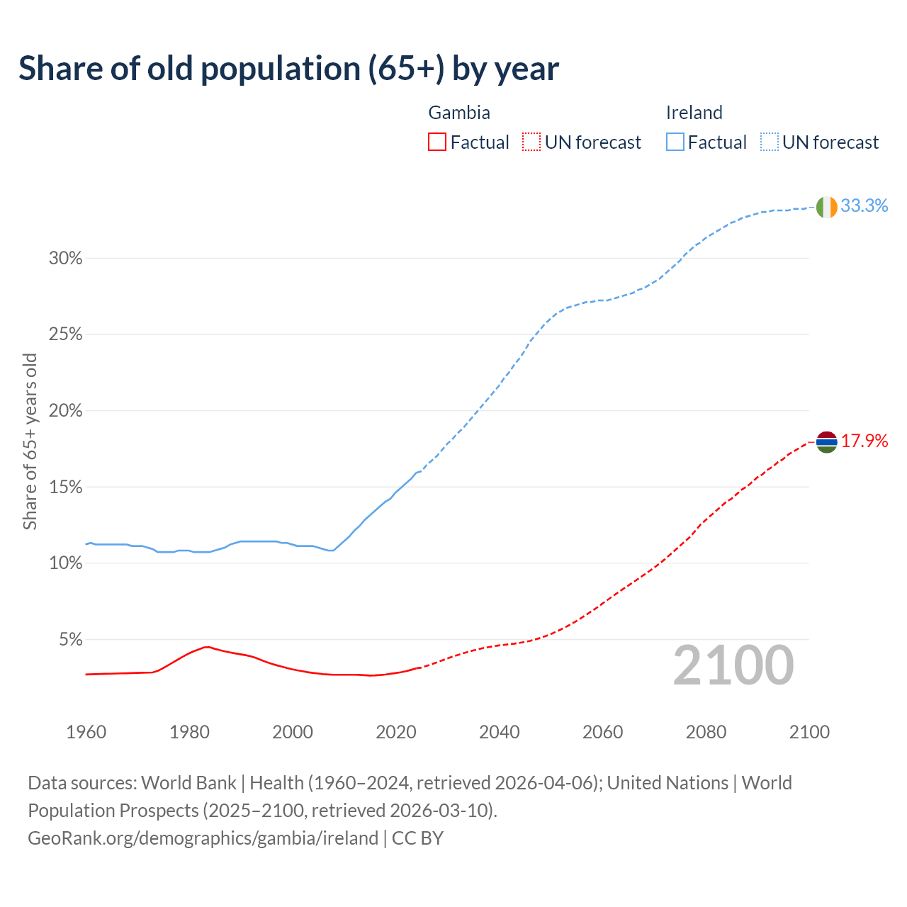 The share of older people aged 65 and over is 3.08% in the Gambia and 15.9% in Ireland. Life expectancy in the Gambia compared to Ireland .