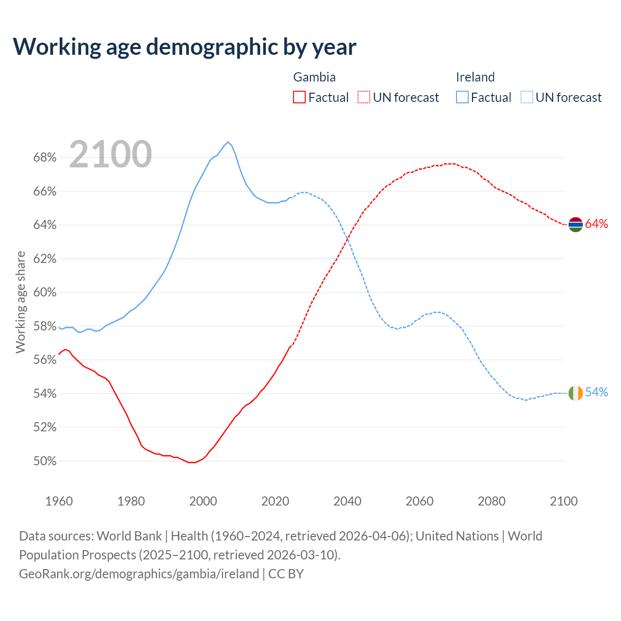Median age Gambia vs Ireland, 1960-2100