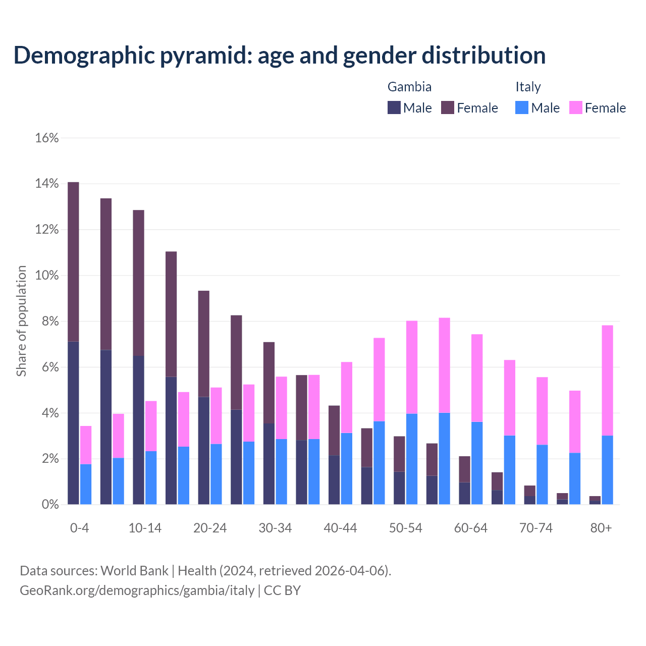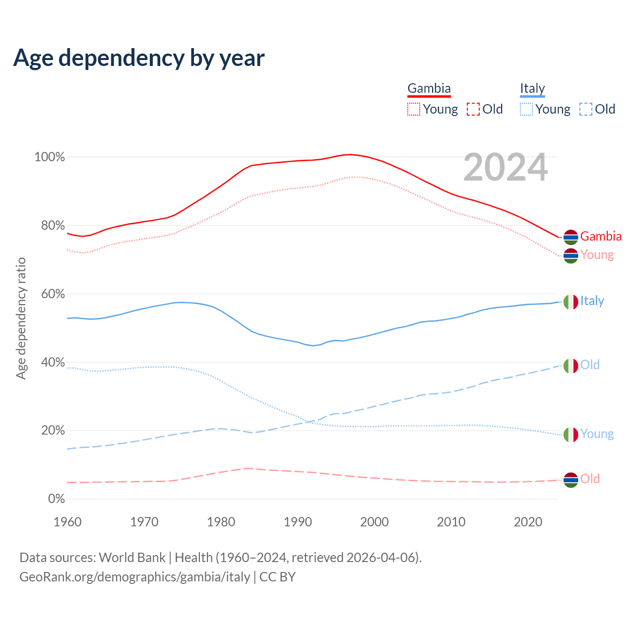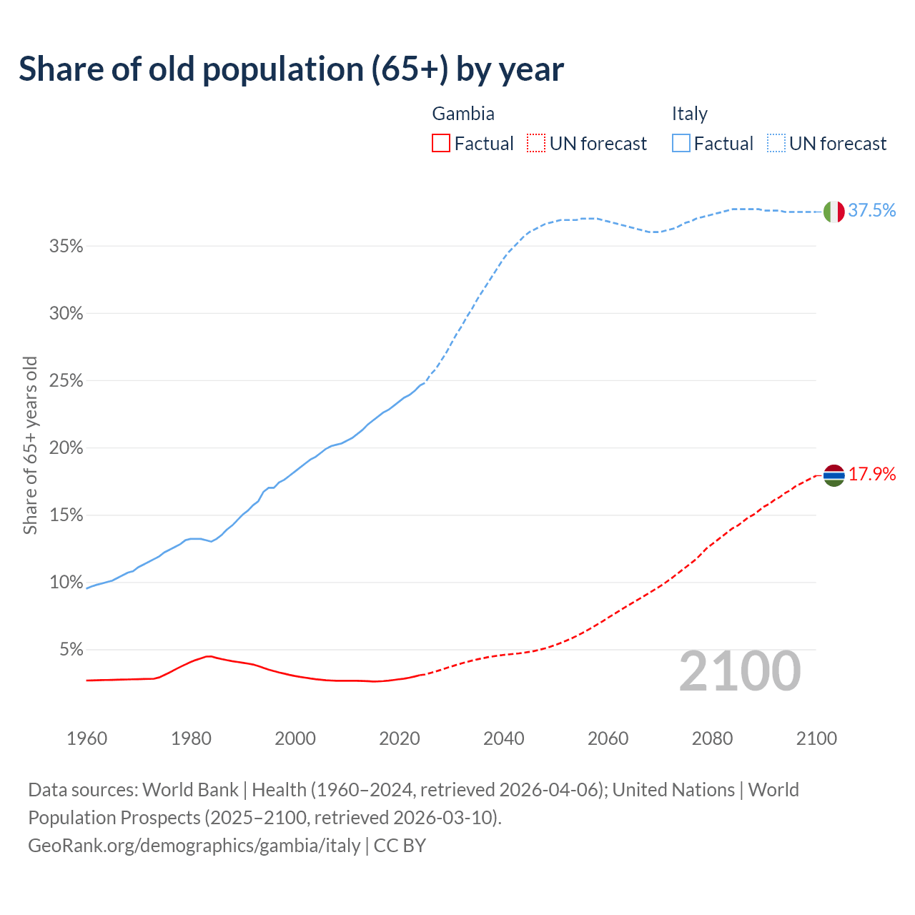 The share of older people aged 65 and over is 3.08% in the Gambia and 24.6% in Italy. Life expectancy in the Gambia compared to Italy .