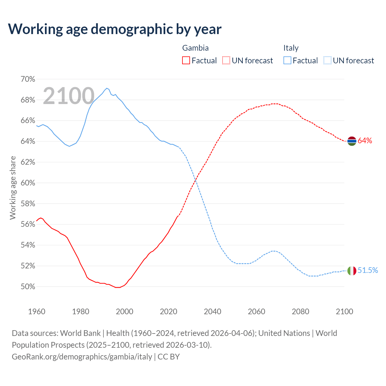 - The Gambia has 1.64M working age adults (aged 15-64) vs 37.2M in Italy.