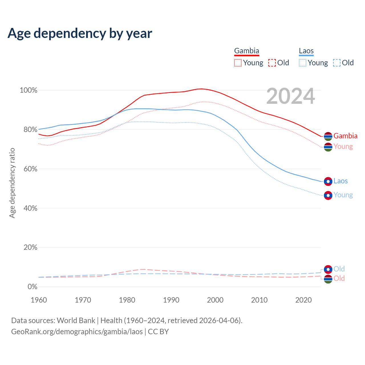 - The Gambia is ranked 171/196 by median age (oldest to youngest) vs 130/196 for Laos.