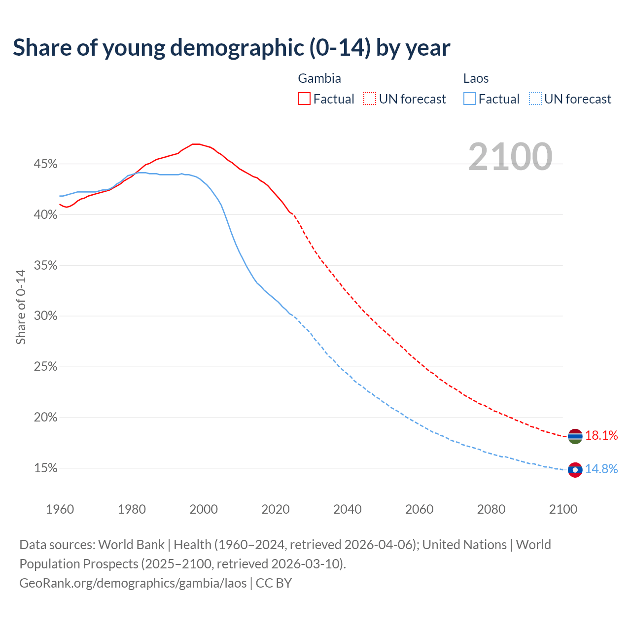 - The share of young demographic (0-15 years old) in the Gambia is 40.2% vs 30.2% in Laos.