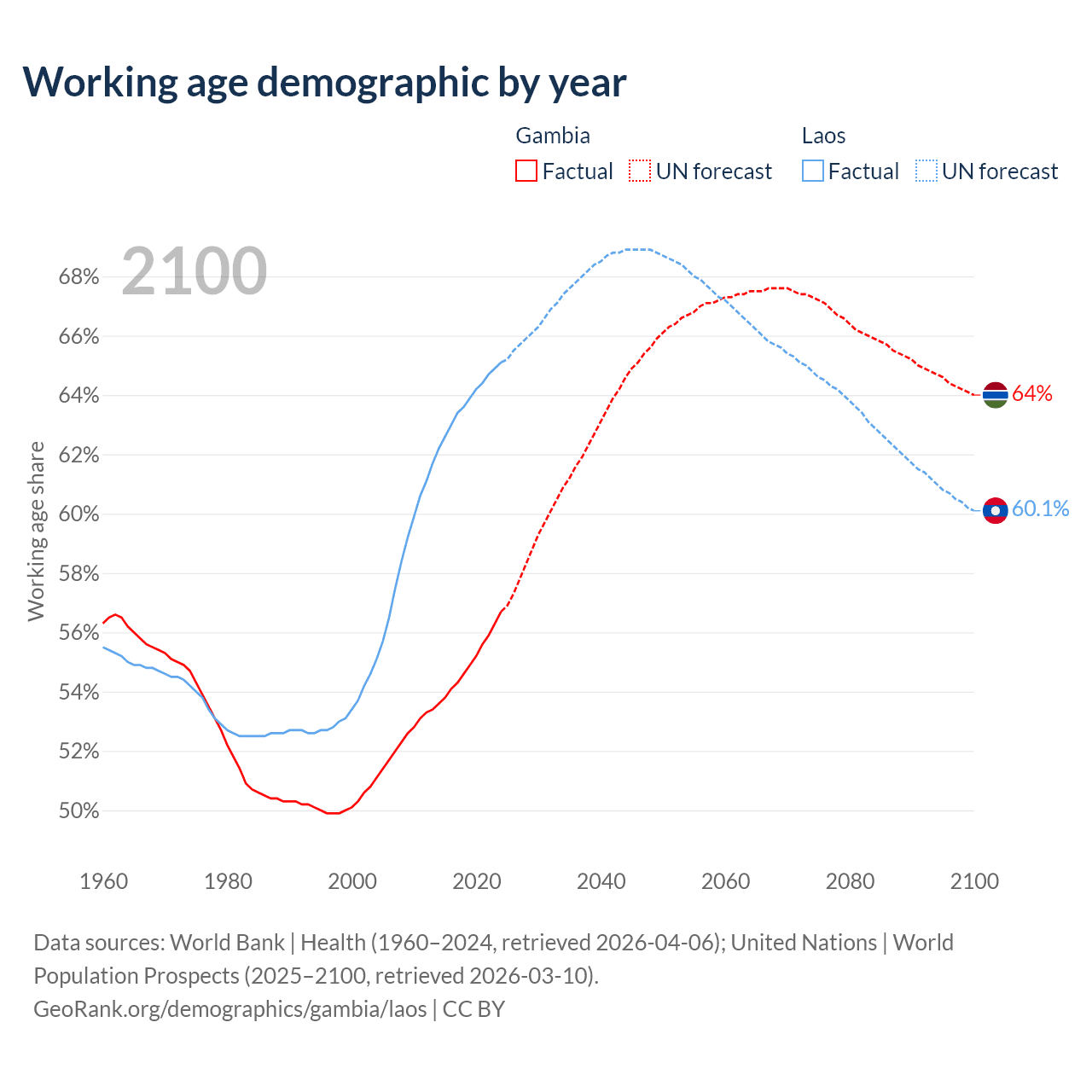 - The share of old-age demographic (65+) in the Gambia is 3.08% vs 4.67% in Laos.