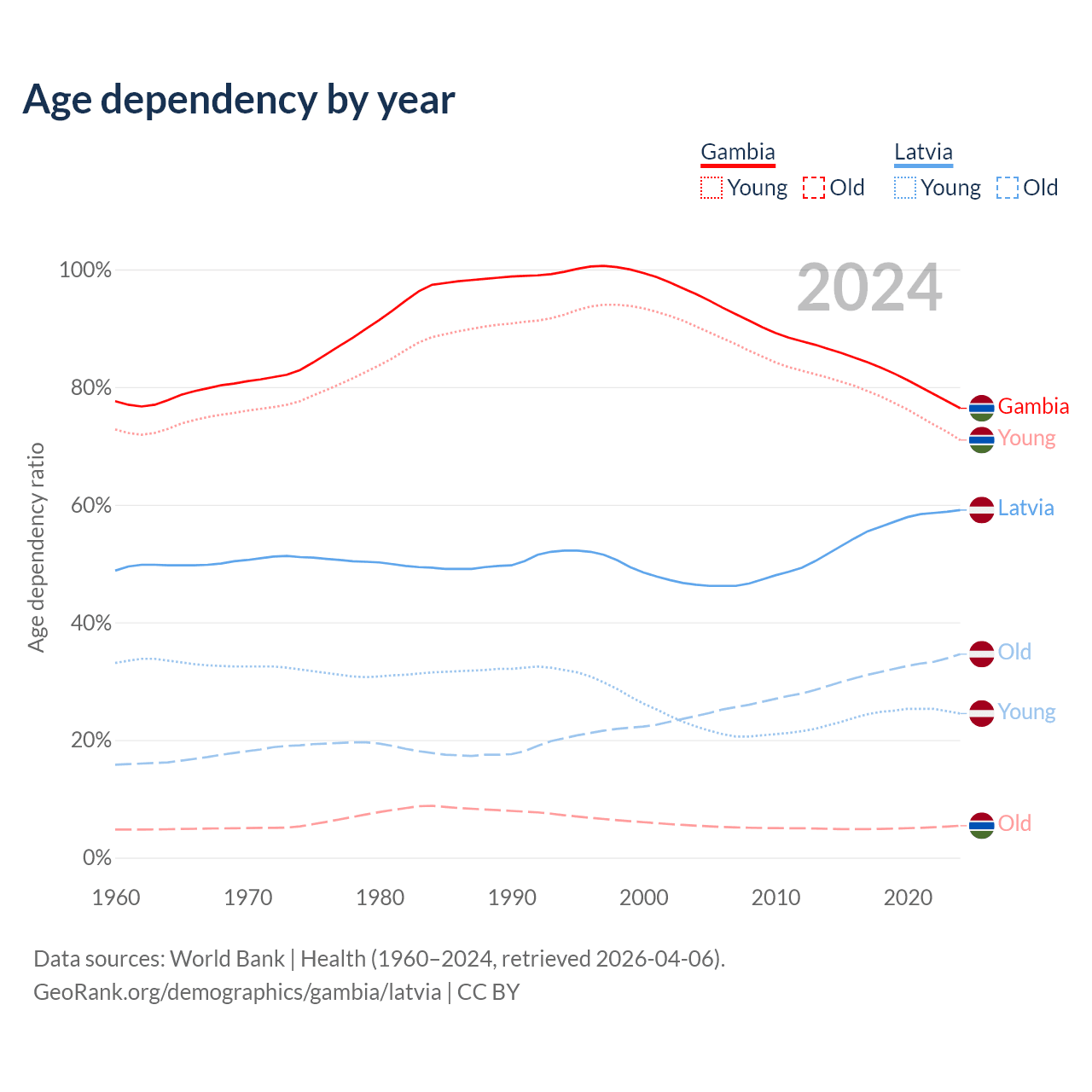 - The Gambia is ranked 171/196 by median age (oldest to youngest) vs 20/196 for Latvia.