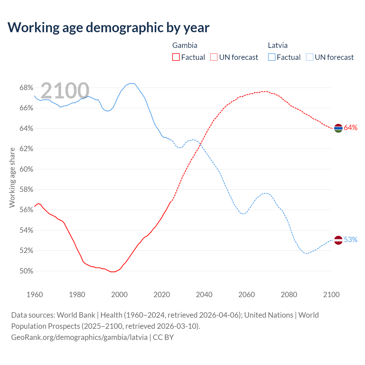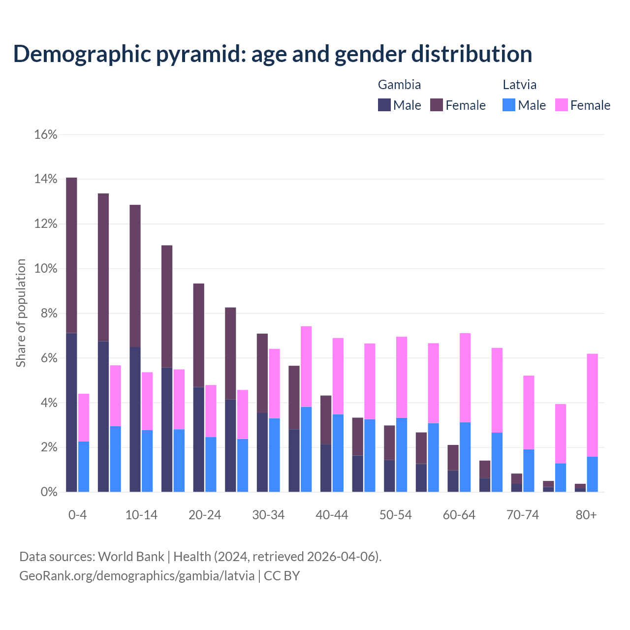 The share of older people aged 65 and over is 3.08% in the Gambia and 21.7% in Latvia. Life expectancy in the Gambia compared to Latvia .