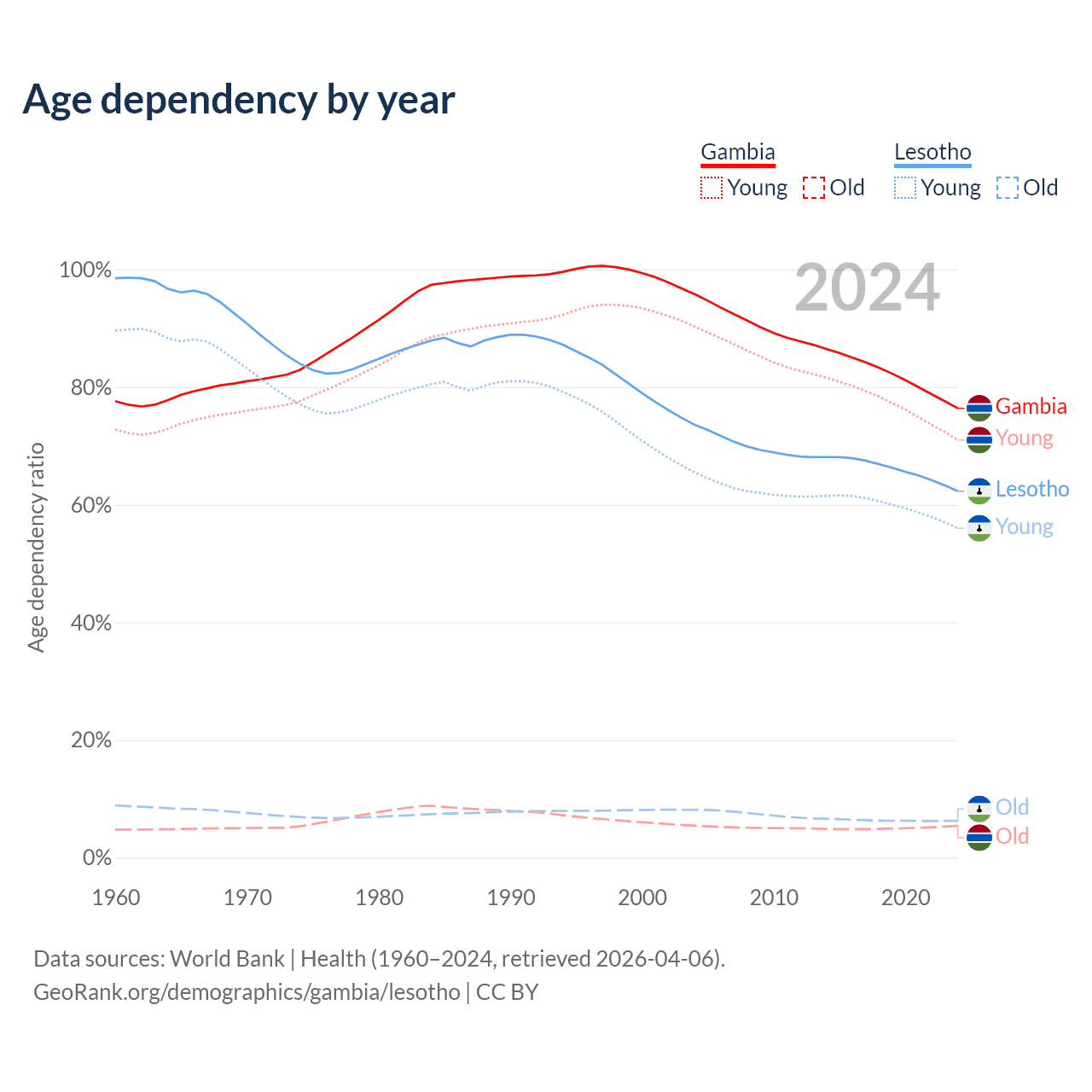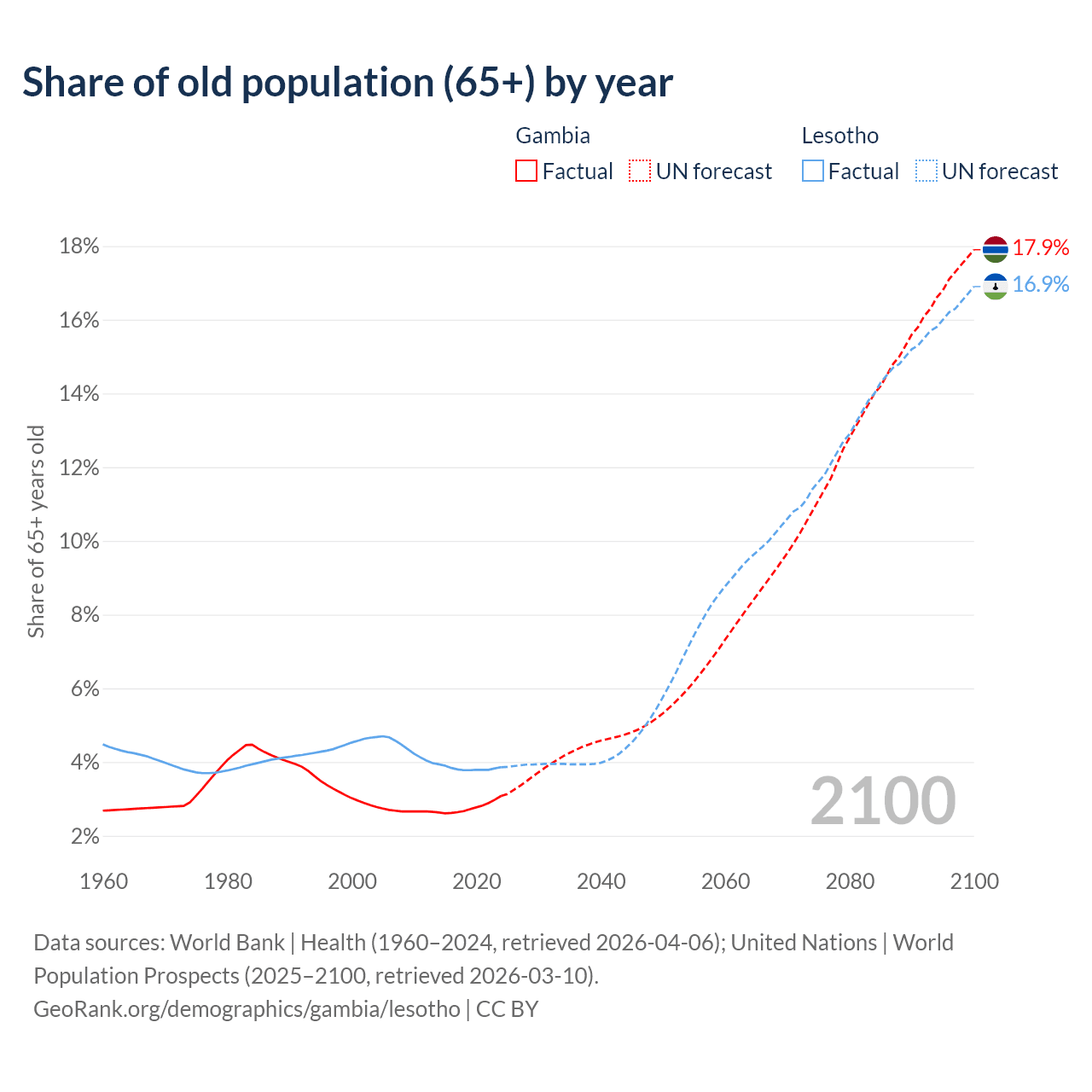 The share of older people aged 65 and over is 3.08% in the Gambia and 3.86% in Lesotho. Life expectancy in the Gambia compared to Lesotho .