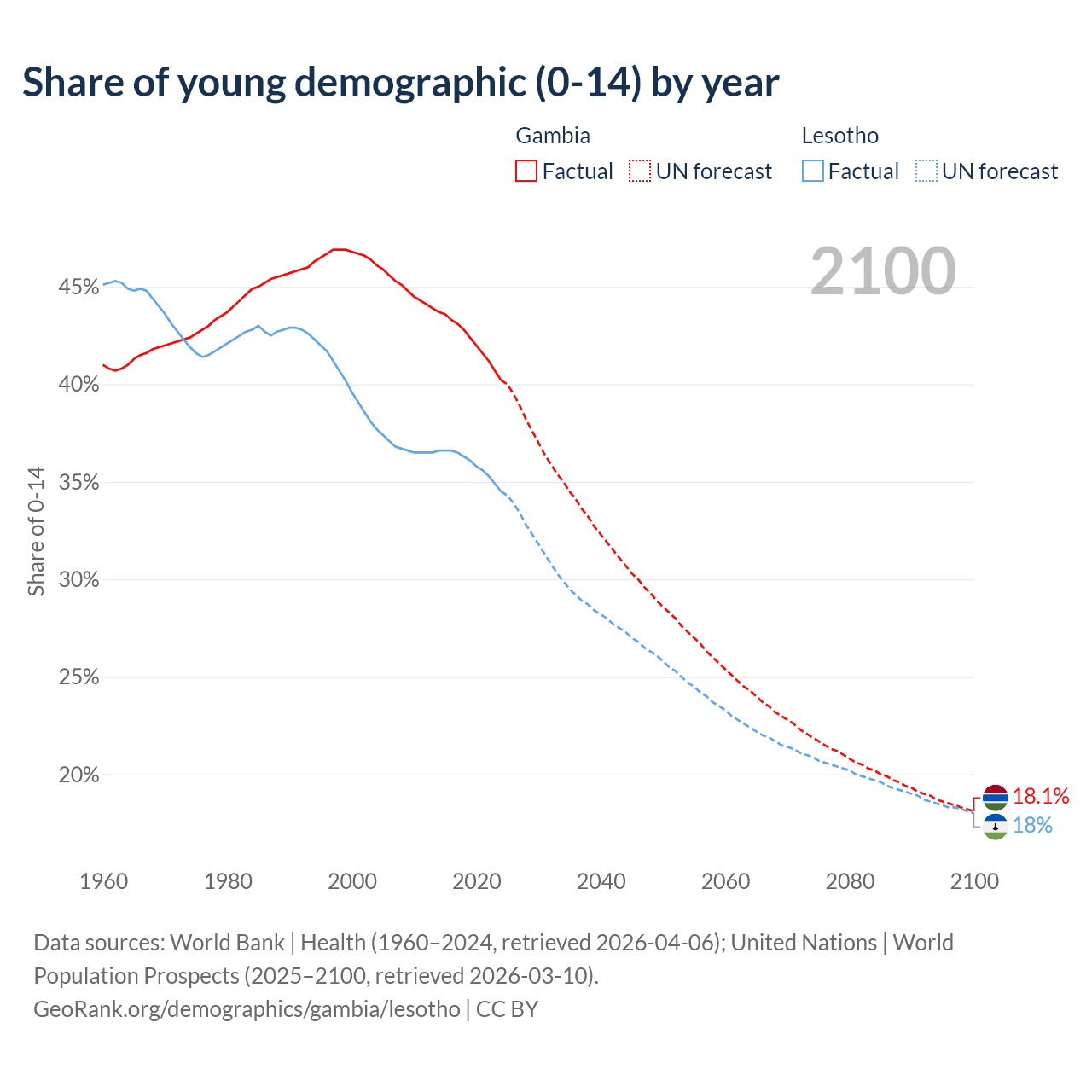 - The share of young demographic (0-15 years old) in the Gambia is 40.2% vs 34.5% in Lesotho.