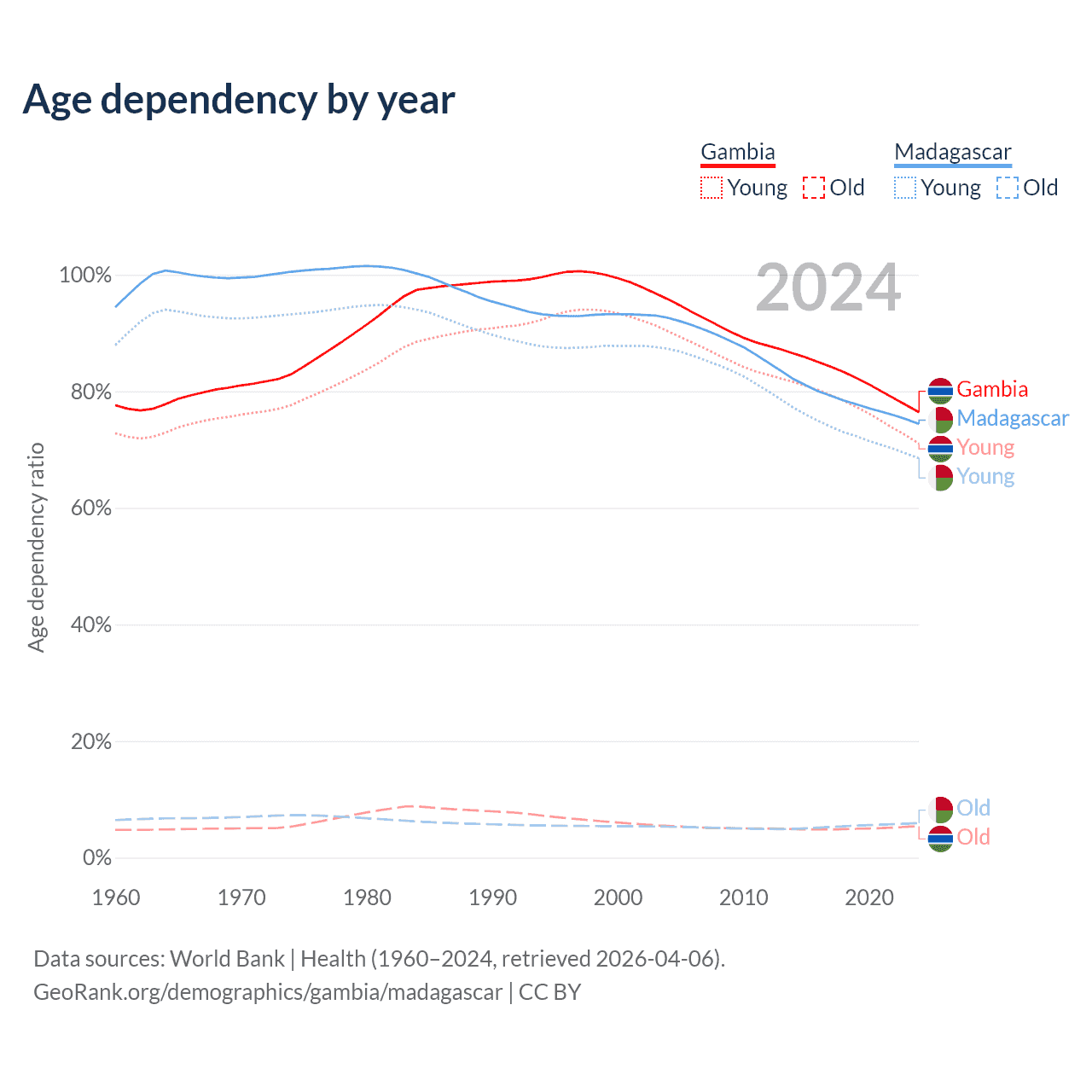 - The Gambia is ranked 171/196 by median age (oldest to youngest) vs 165/196 for Madagascar.