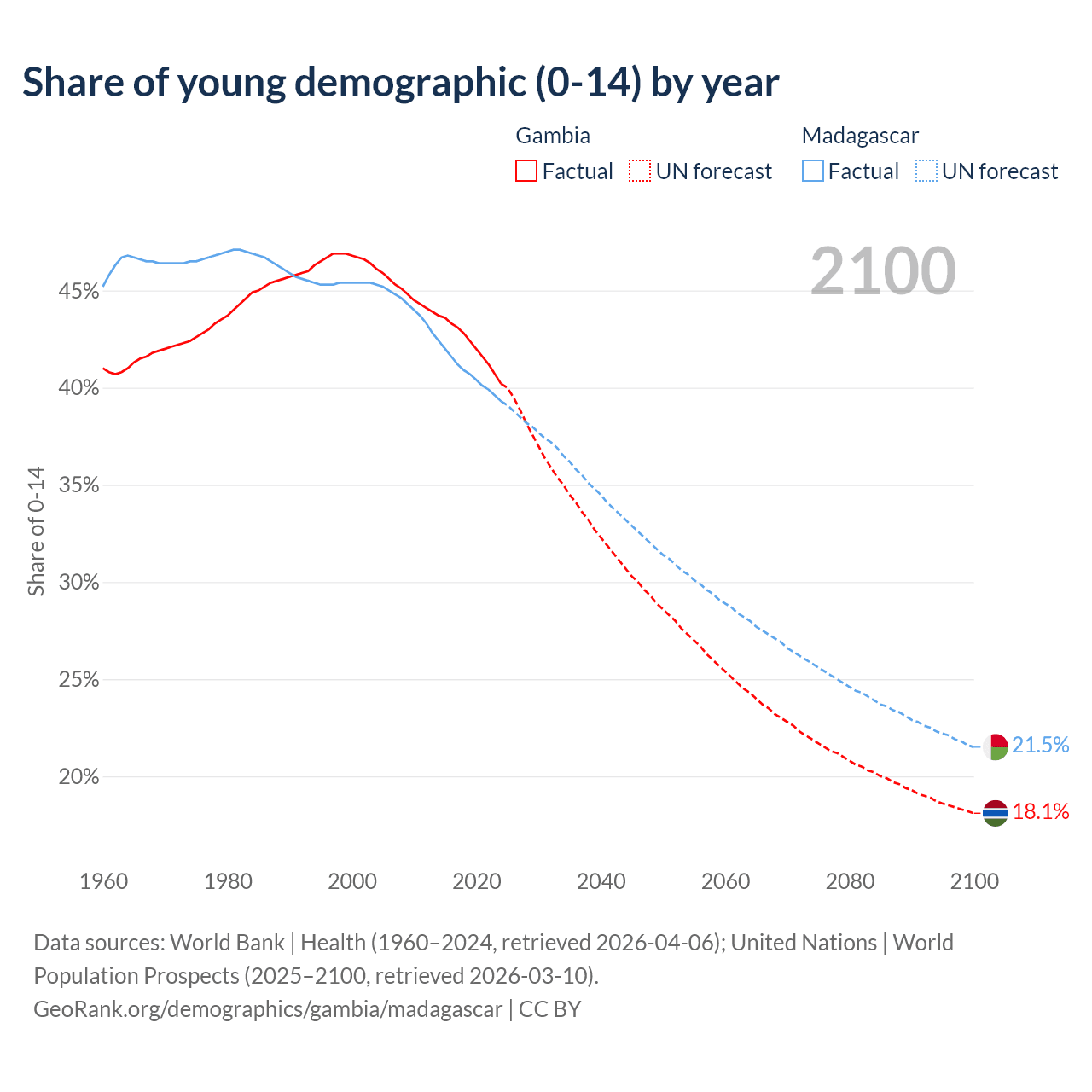 - The share of young demographic (0-15 years old) in the Gambia is 40.2% vs 39.3% in Madagascar.