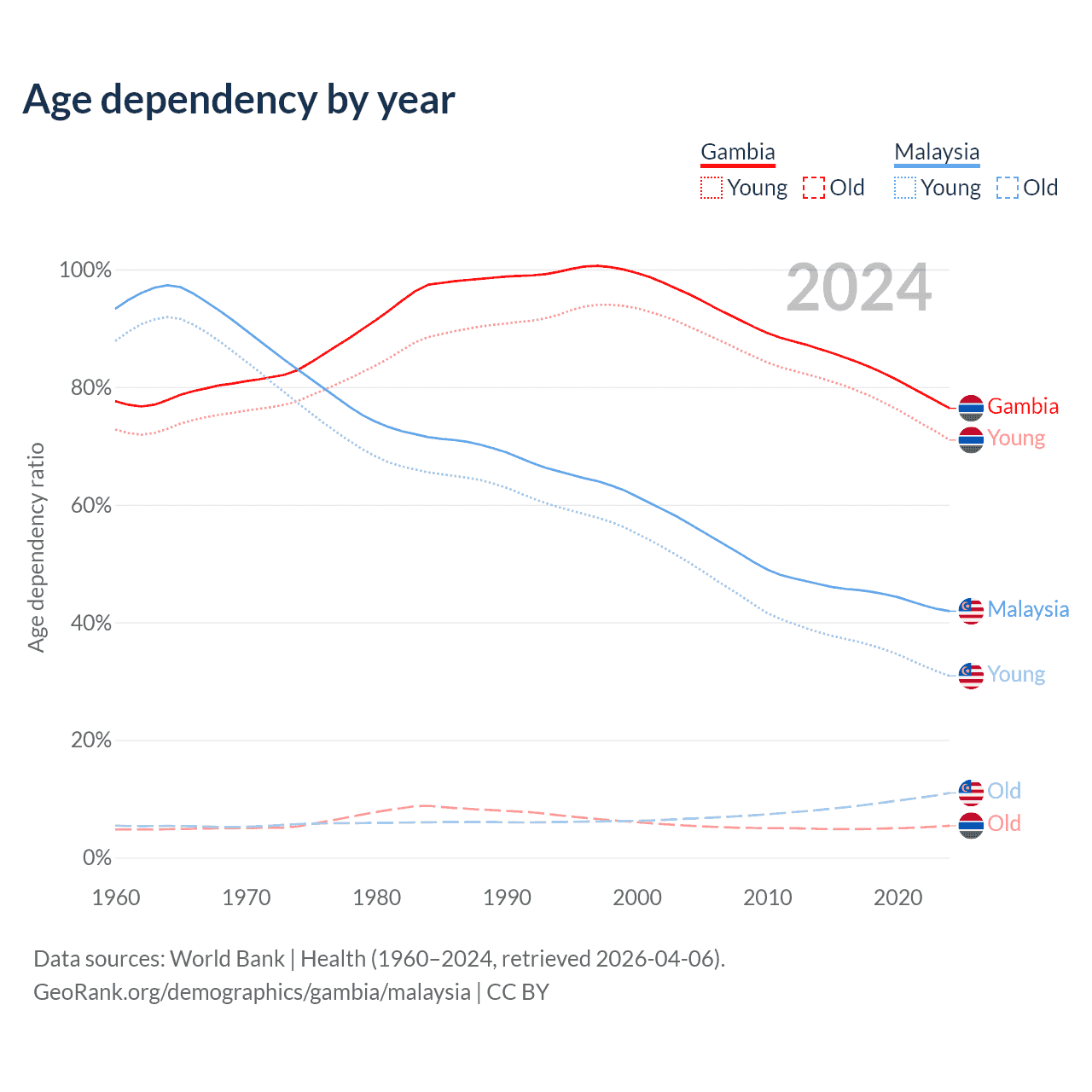 - The Gambia is ranked 171/196 by median age (oldest to youngest) vs 92/196 for Malaysia.