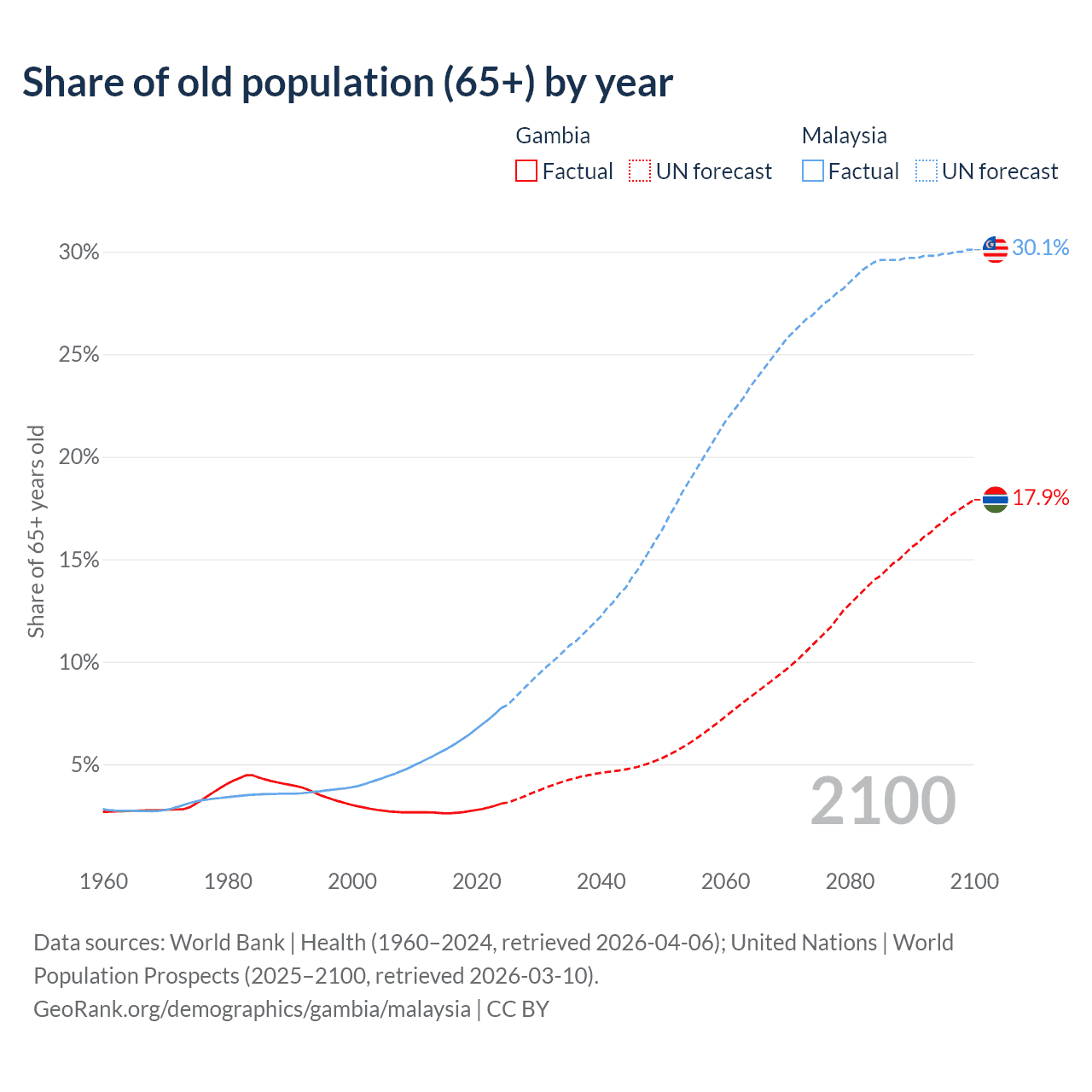 - The share of old-age demographic (65+) in the Gambia is 3.08% vs 7.74% in Malaysia.
