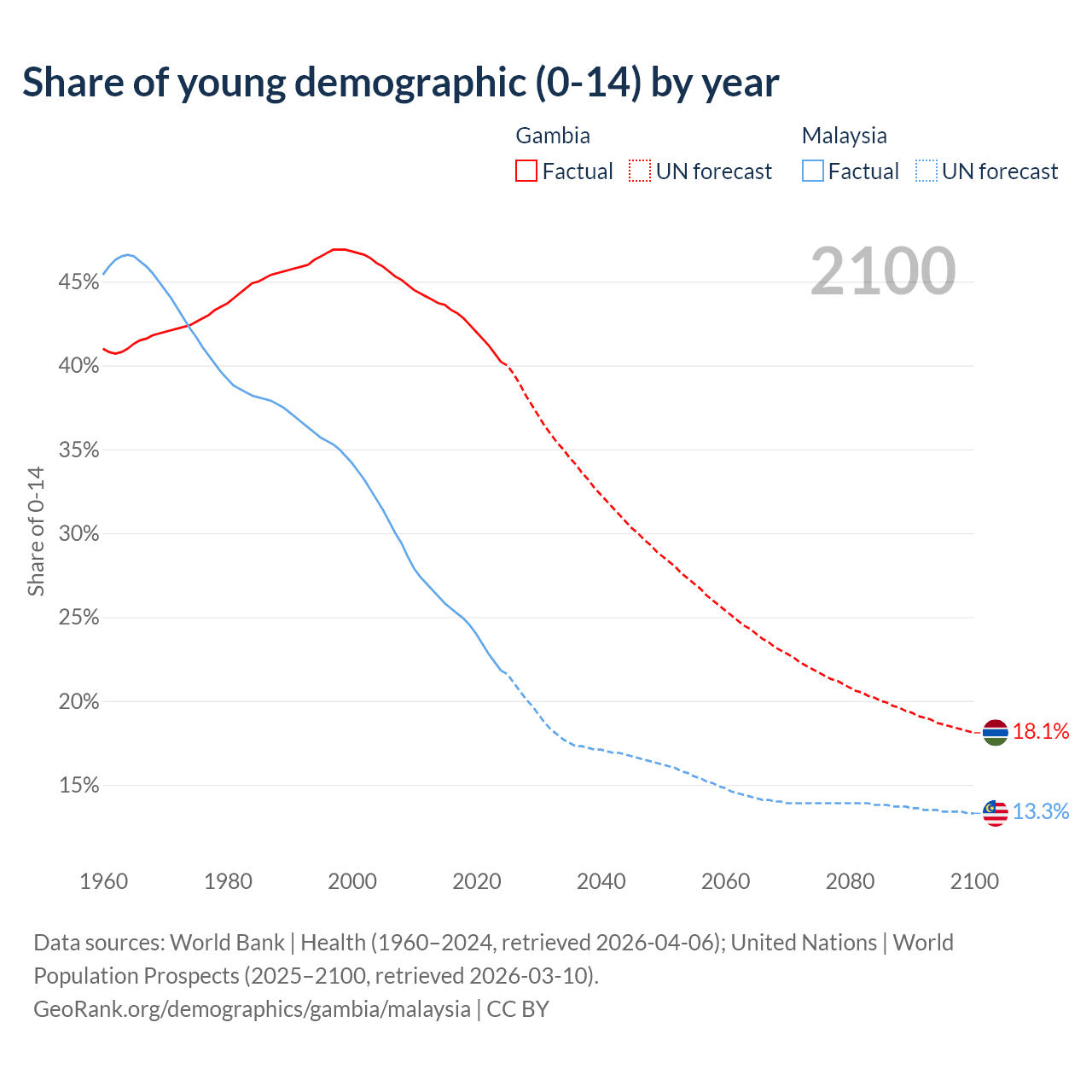 - The share of young demographic (0-15 years old) in the Gambia is 40.2% vs 21.8% in Malaysia.
