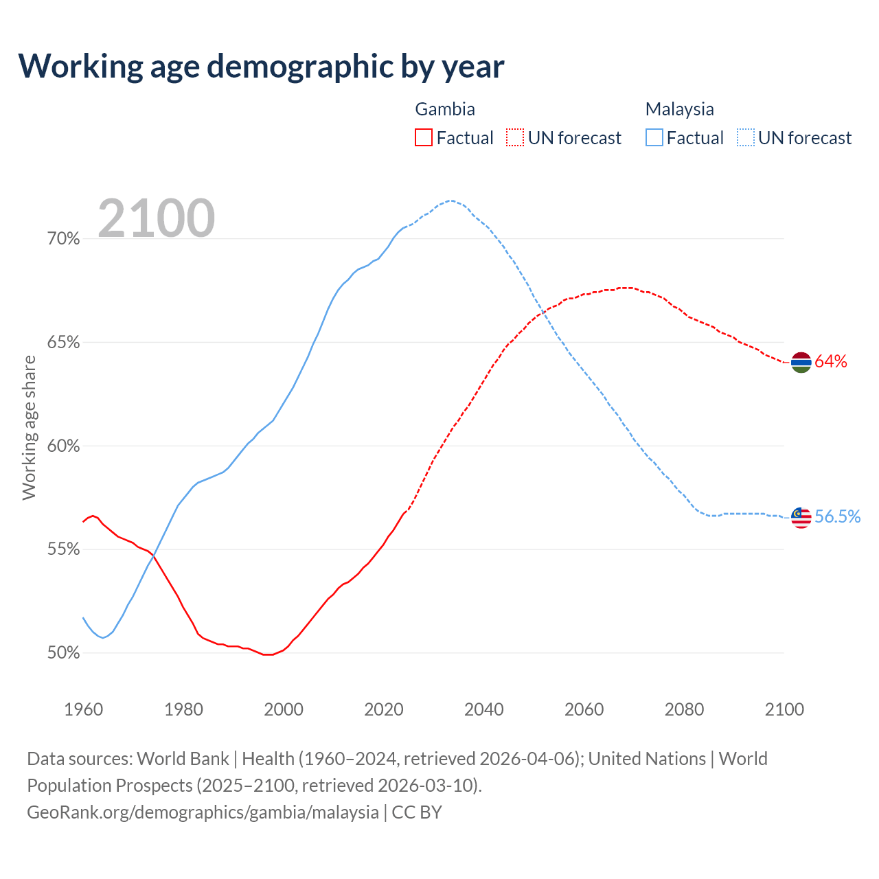 - The Gambia has 1.64M working age adults (aged 15-64) vs 25.7M in Malaysia.