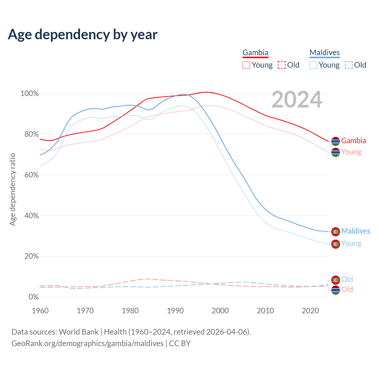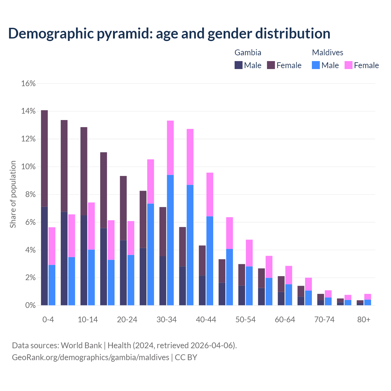 - The Gambia is ranked 171/196 by median age (oldest to youngest) vs 90/196 for Maldives.