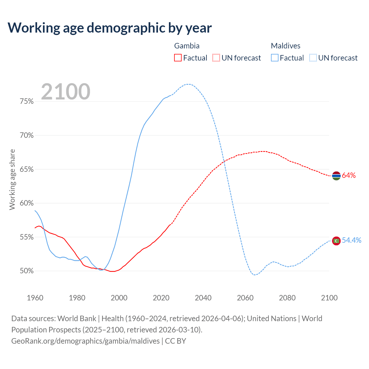 The share of older people aged 65 and over is 3.08% in the Gambia and 4.64% in Maldives. Life expectancy in the Gambia compared to Maldives .