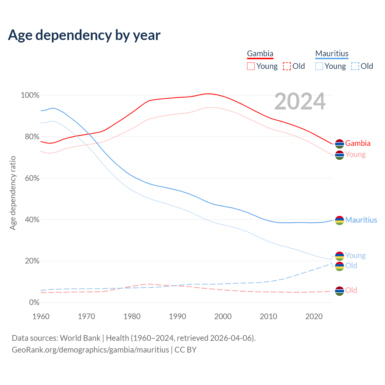 - The Gambia is ranked 171/196 by median age (oldest to youngest) vs 57/196 for Mauritius.