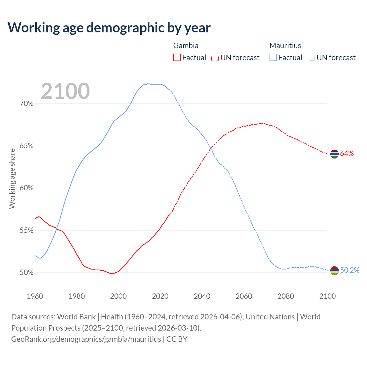 - The Gambia has 1.64M working age adults (aged 15-64) vs 889K in Mauritius.