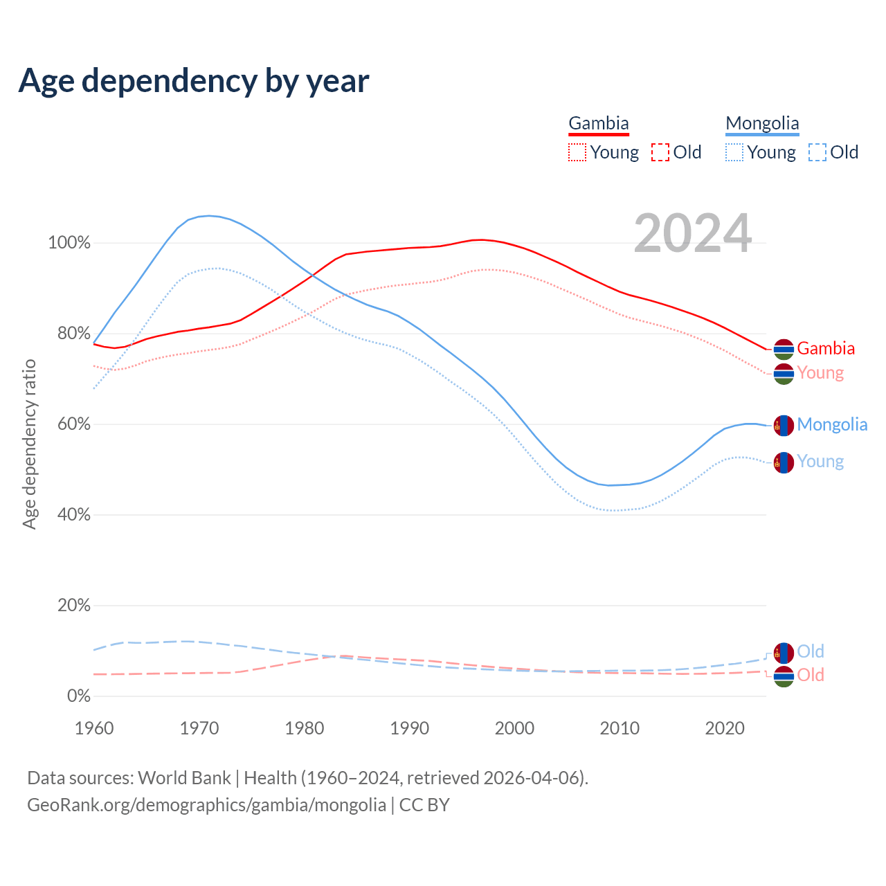 - The Gambia is ranked 171/196 by median age (oldest to youngest) vs 117/196 for Mongolia.