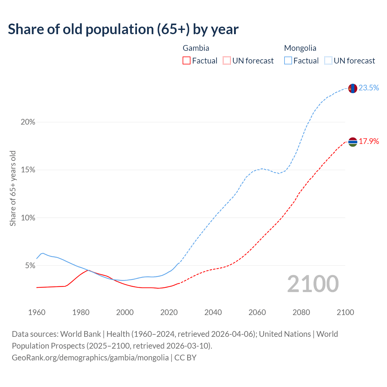 - The share of old-age demographic (65+) in the Gambia is 3.08% vs 5.14% in Mongolia.