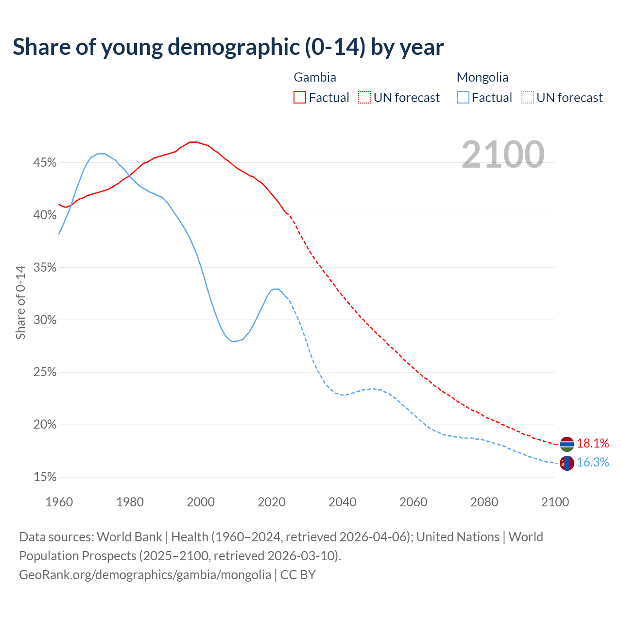 - The share of young demographic (0-15 years old) in the Gambia is 40.2% vs 32.2% in Mongolia.