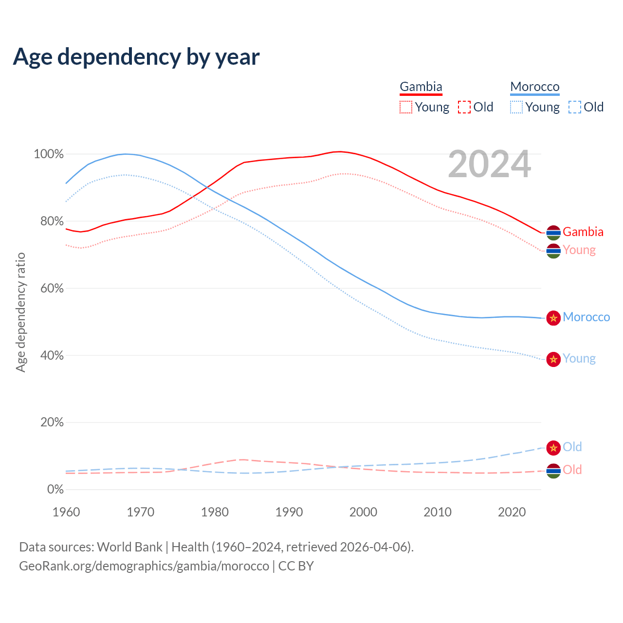 - The Gambia is ranked 171/196 by median age (oldest to youngest) vs 100/196 for Morocco.