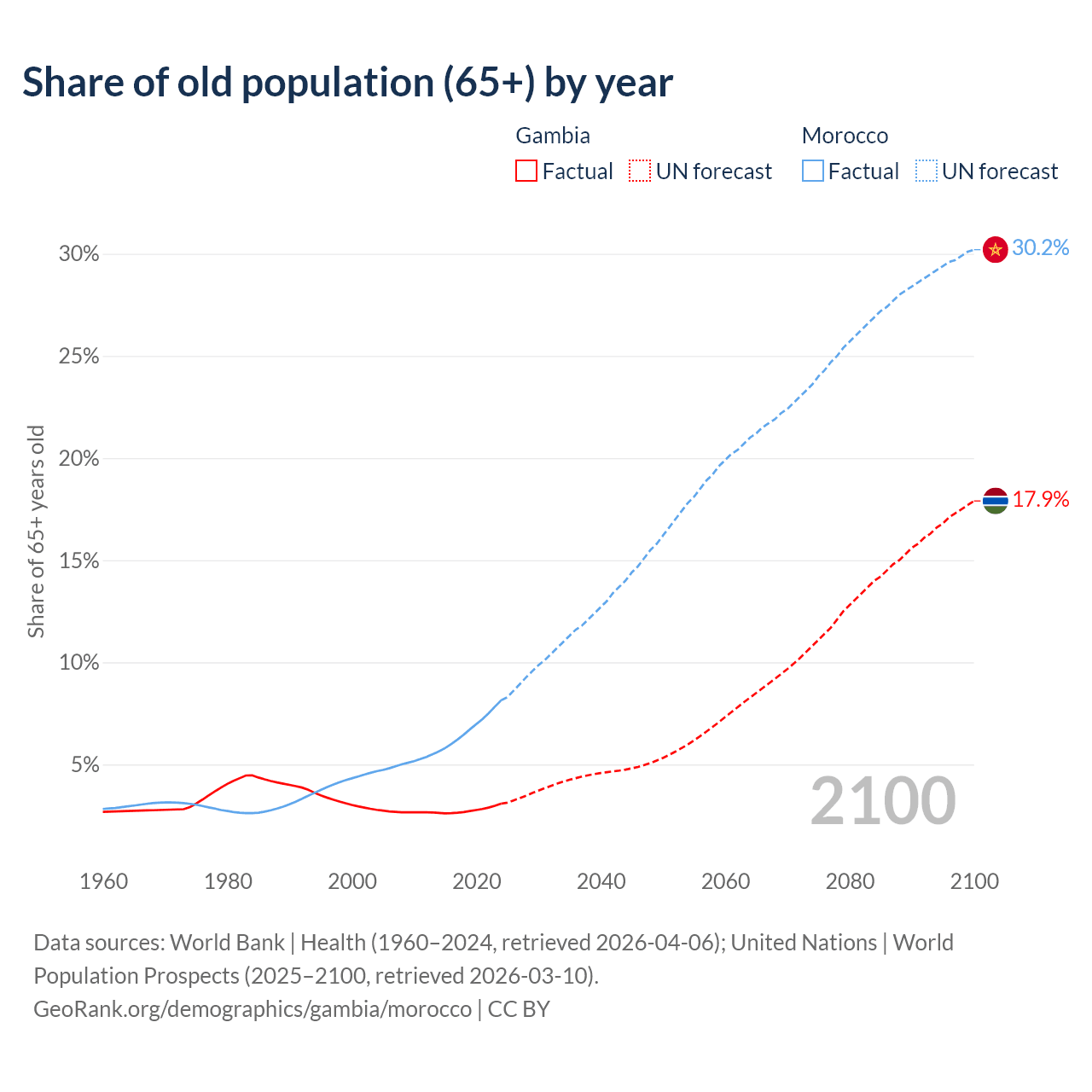 The share of older people aged 65 and over is 3.08% in the Gambia and 8.14% in Morocco. Life expectancy in the Gambia compared to Morocco .