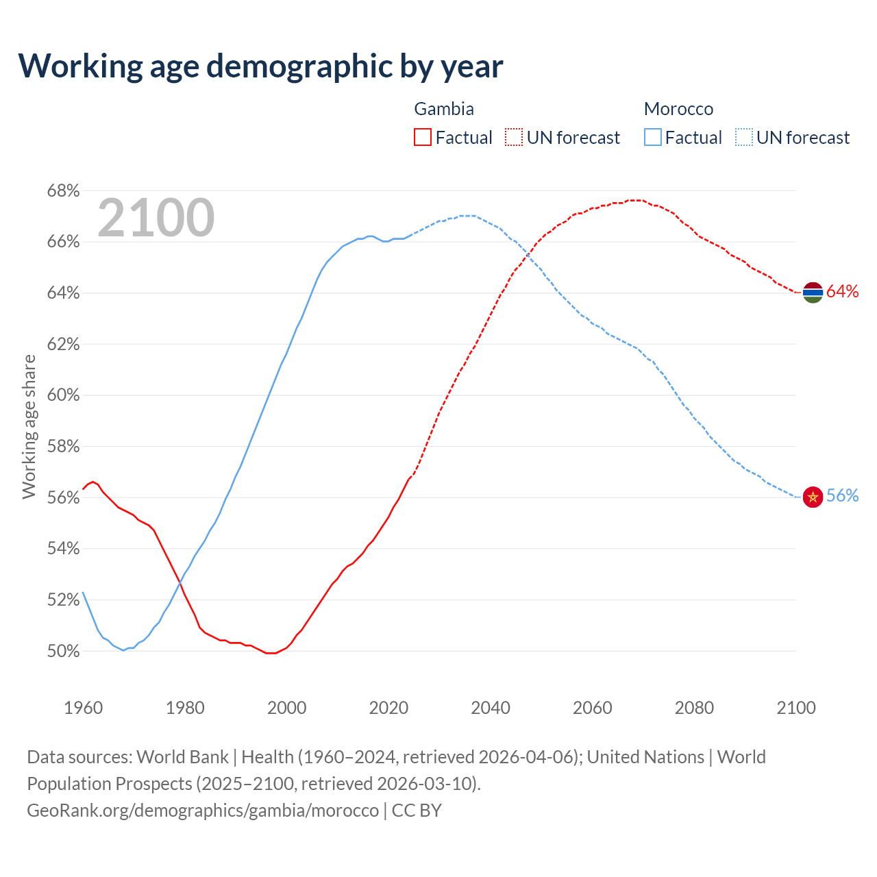 Median age Gambia vs Morocco, 1960-2100