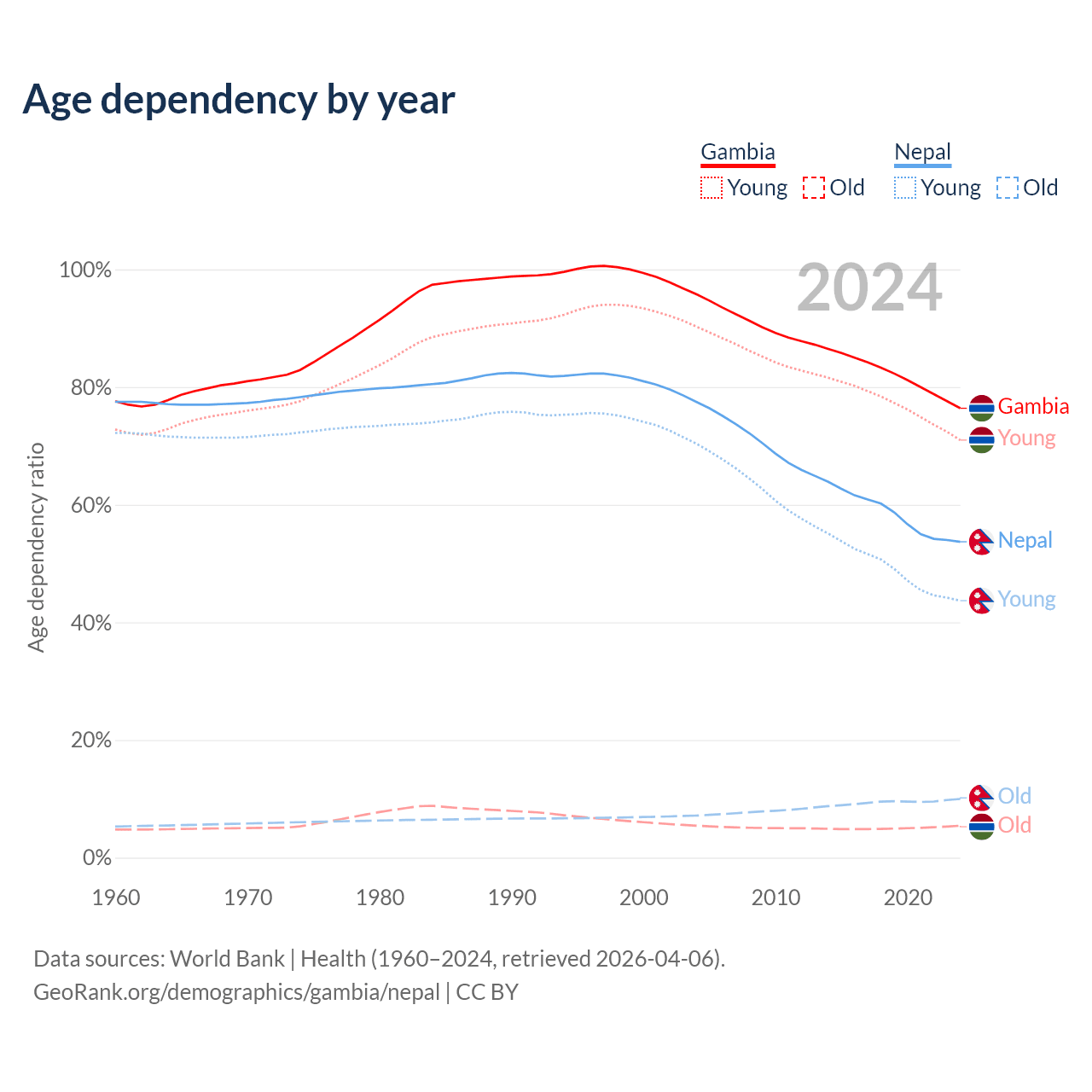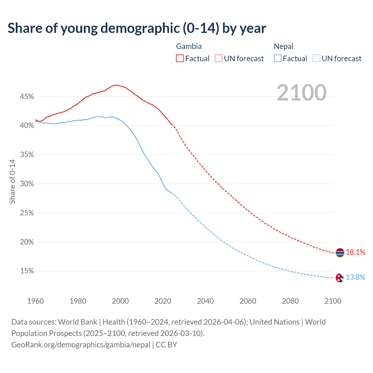 - The share of young demographic (0-15 years old) in the Gambia is 40.2% vs 28.4% in Nepal.