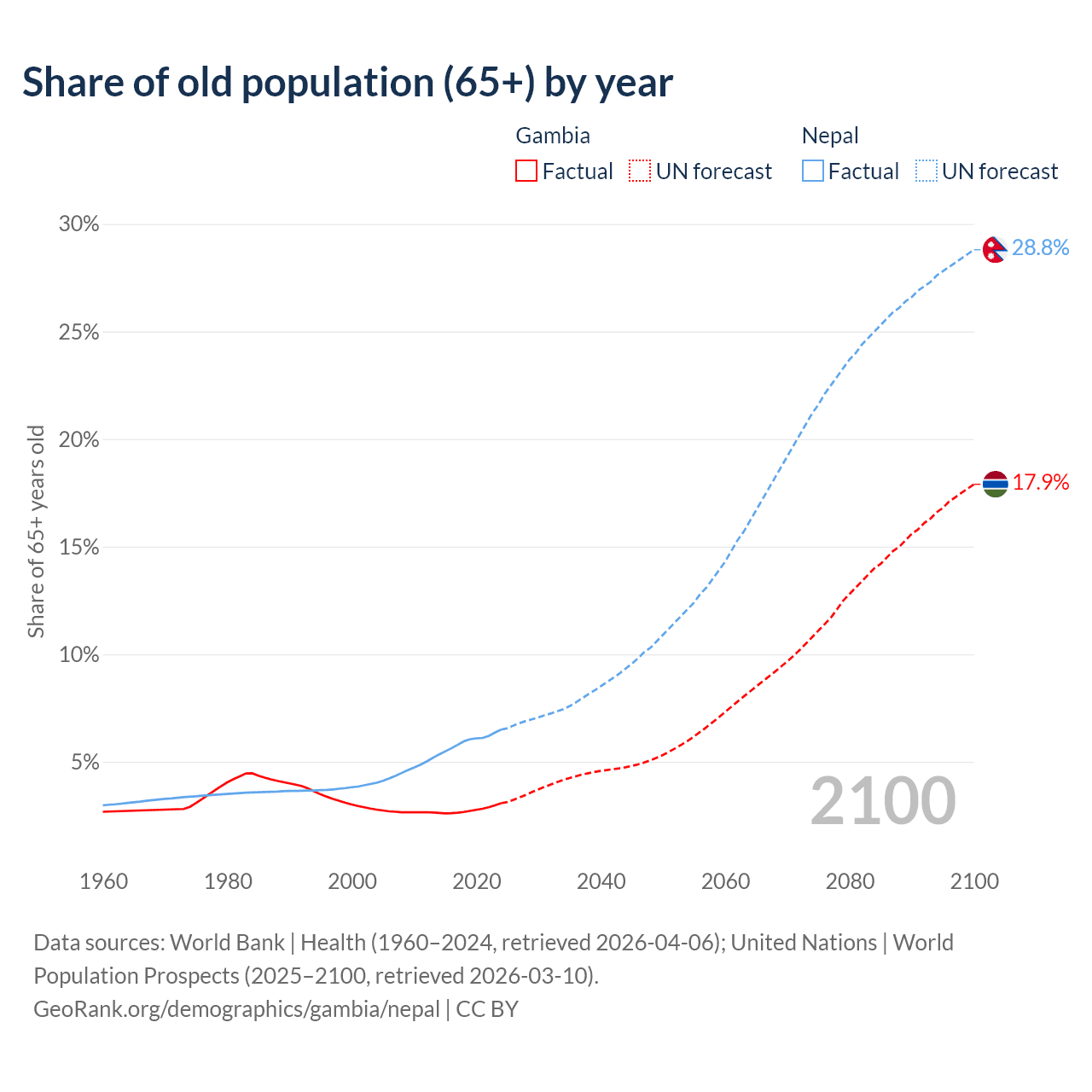The share of older people aged 65 and over is 3.08% in the Gambia and 6.5% in Nepal. Life expectancy in the Gambia compared to Nepal .