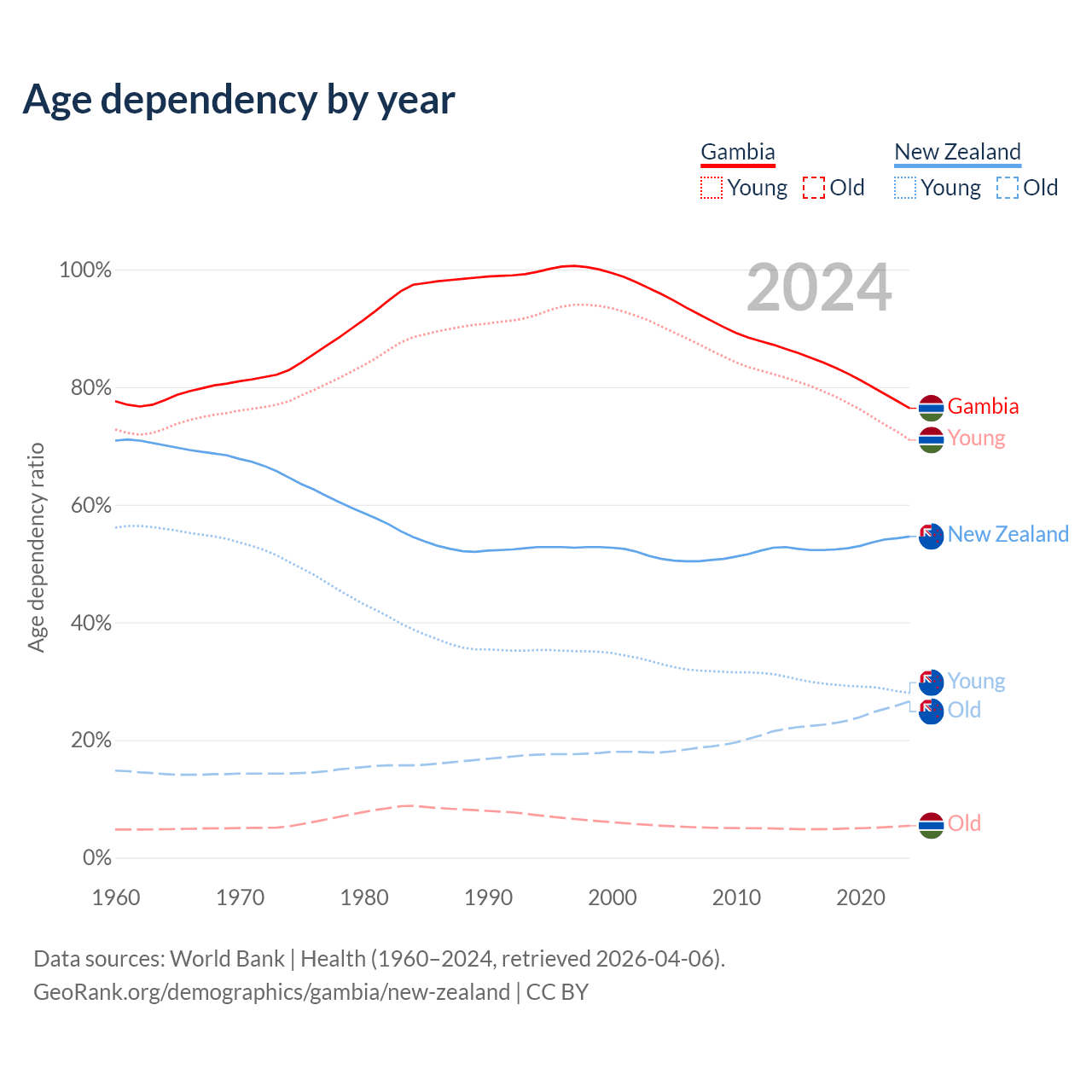- The Gambia is ranked 171/196 by median age (oldest to youngest) vs 56/196 for New Zealand.