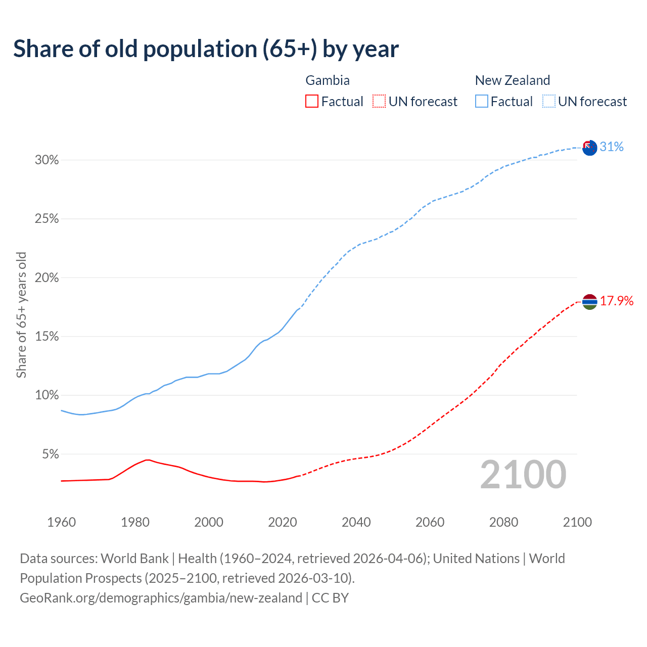The share of older people aged 65 and over is 3.08% in the Gambia and 17.2% in New Zealand. Life expectancy in the Gambia compared to New Zealand .