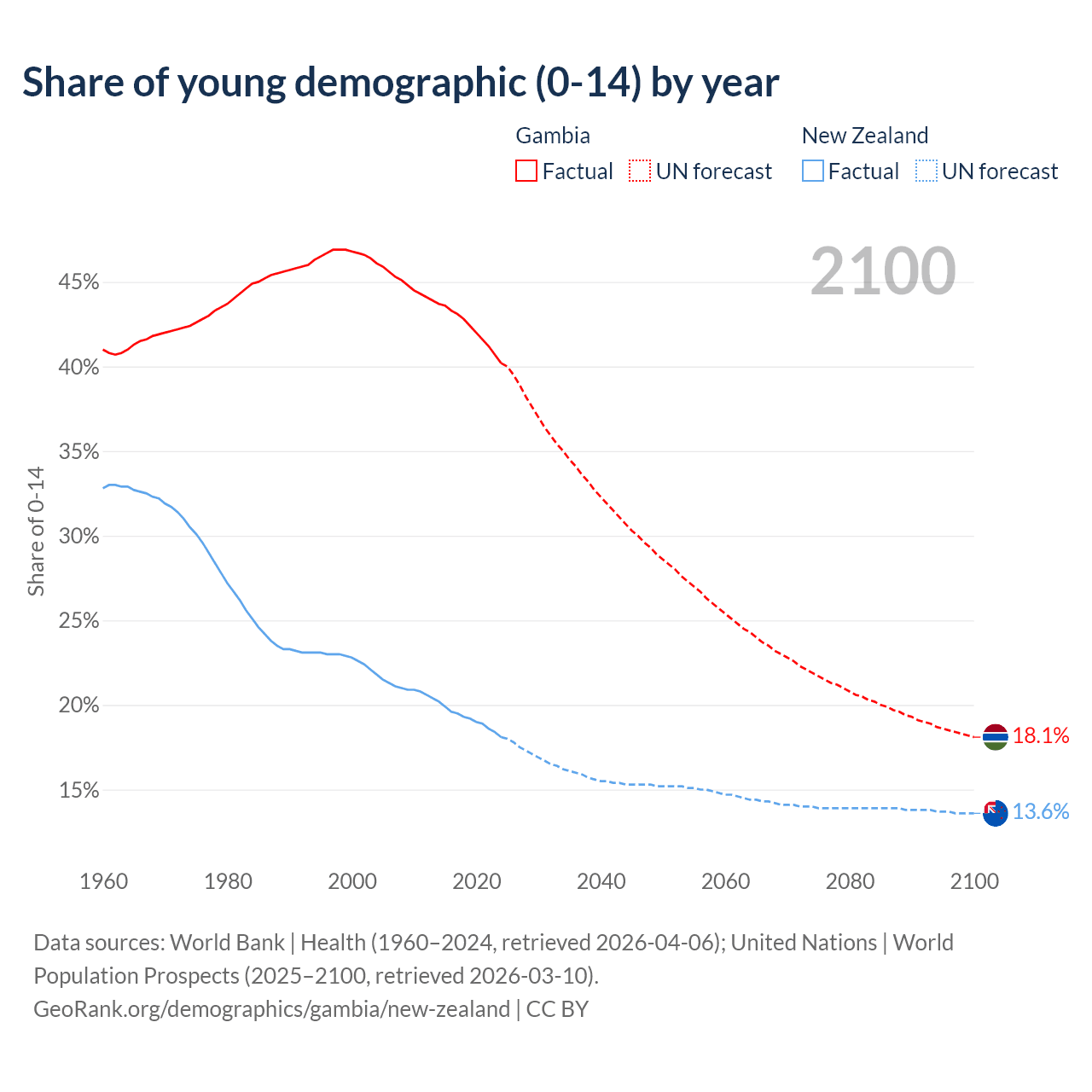 - The share of young demographic (0-15 years old) in the Gambia is 40.2% vs 18.1% in New Zealand.