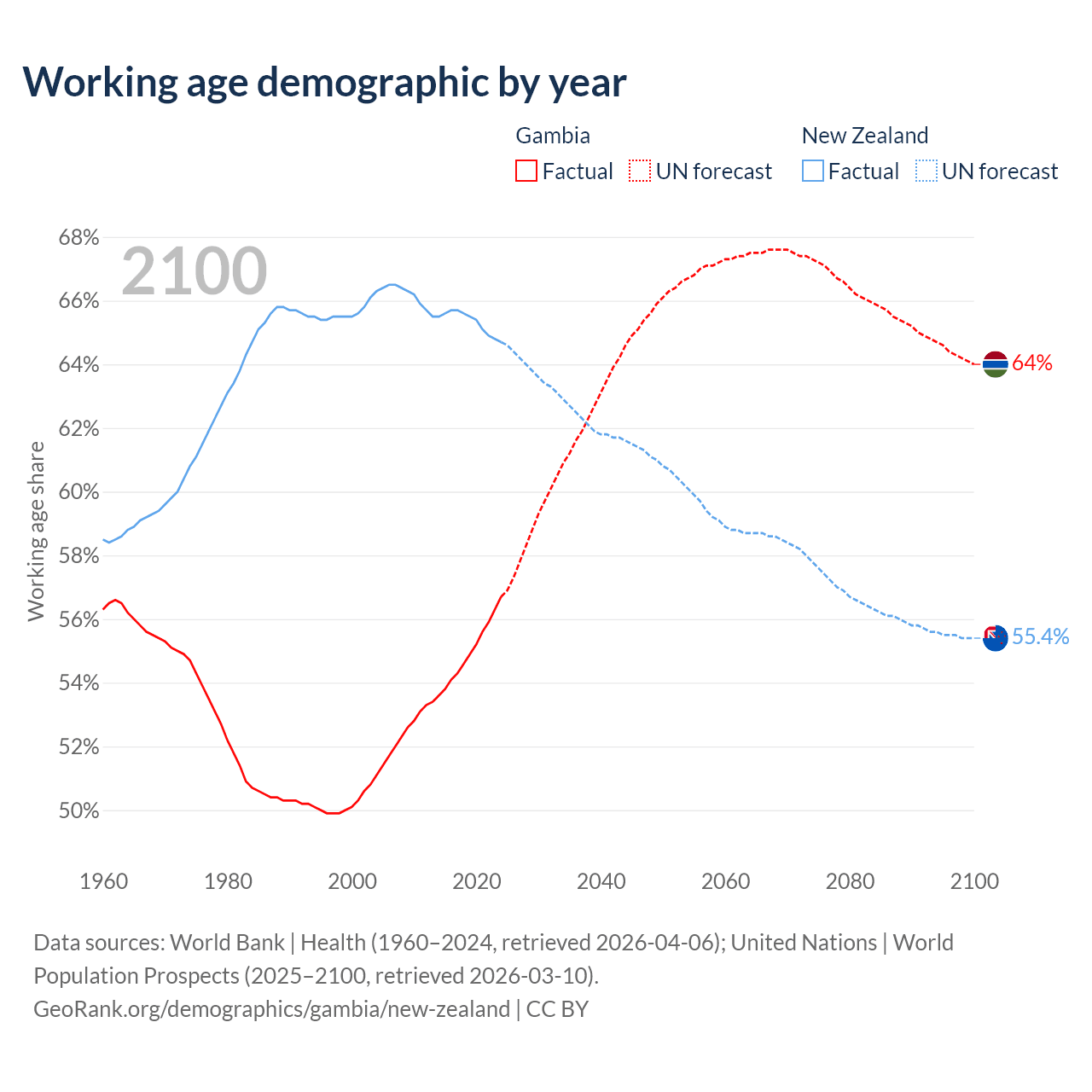 - The Gambia has 1.64M working age adults (aged 15-64) vs 3.48M in New Zealand.