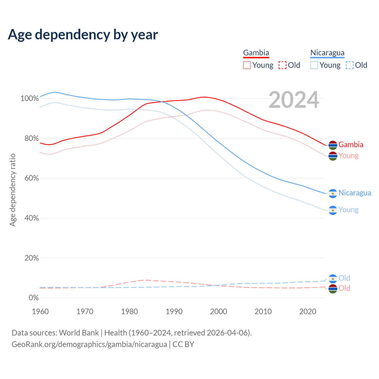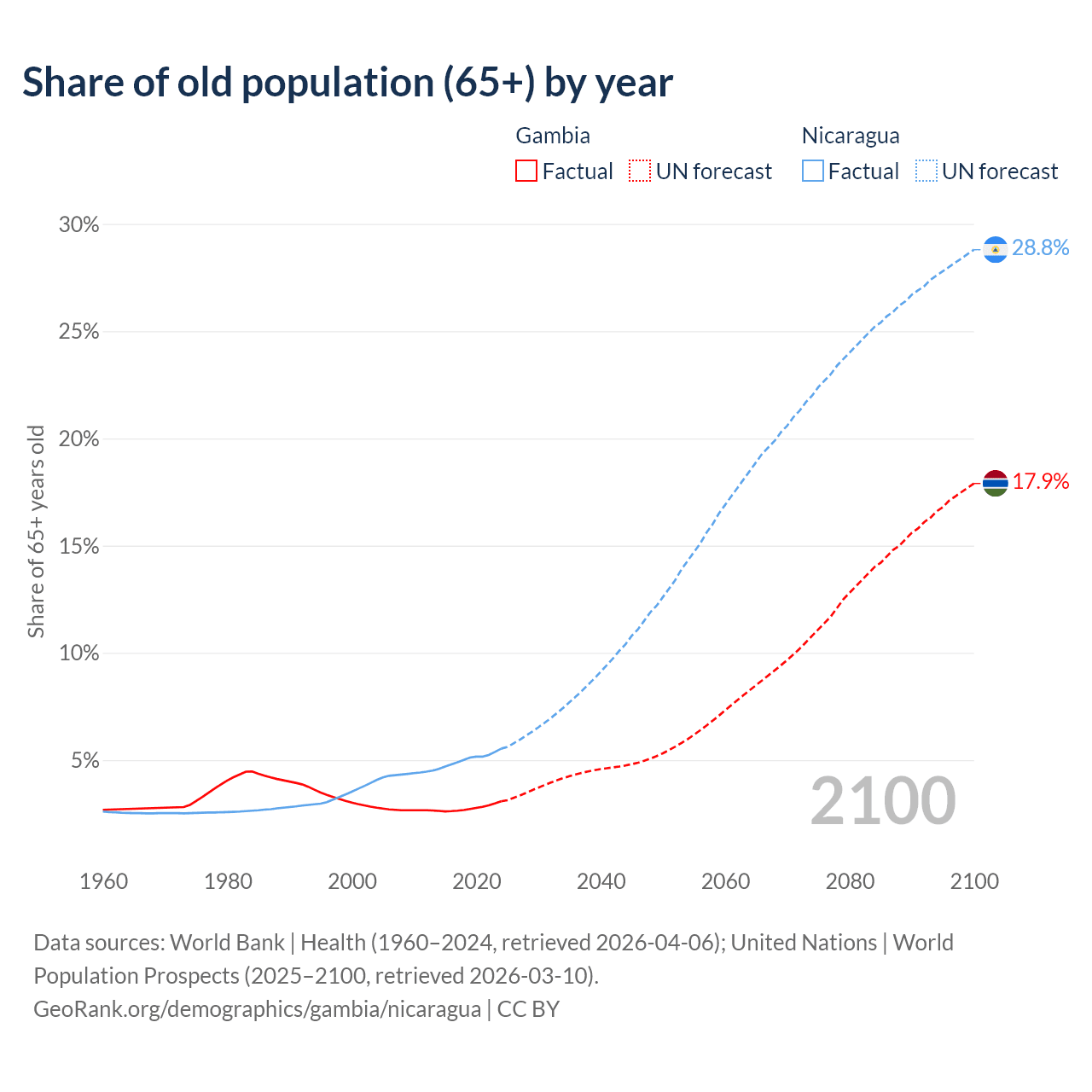 - The share of old-age demographic (65+) in the Gambia is 3.08% vs 5.53% in Nicaragua.