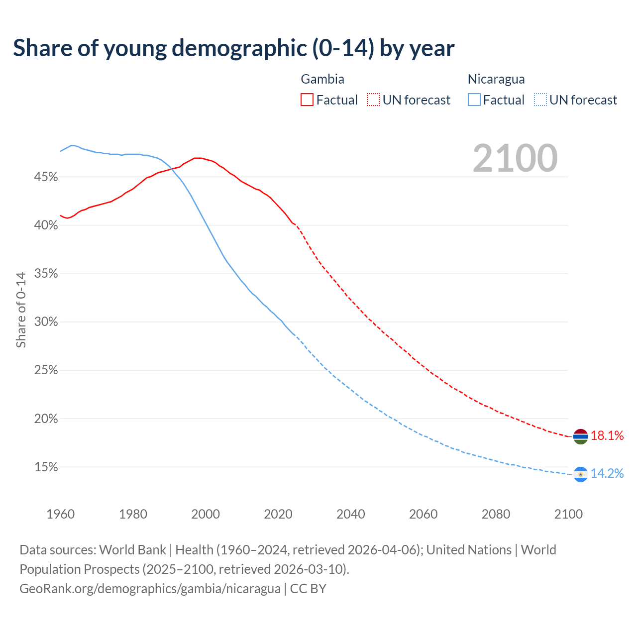 - The share of young demographic (0-15 years old) in the Gambia is 40.2% vs 28.8% in Nicaragua.