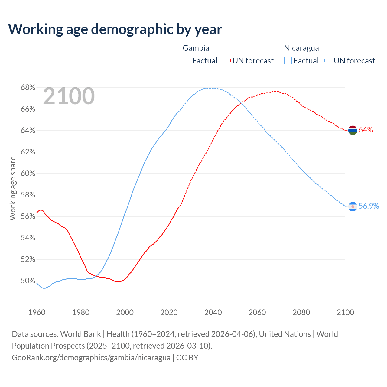 The share of older people aged 65 and over is 3.08% in the Gambia and 5.53% in Nicaragua. Life expectancy in the Gambia compared to Nicaragua .