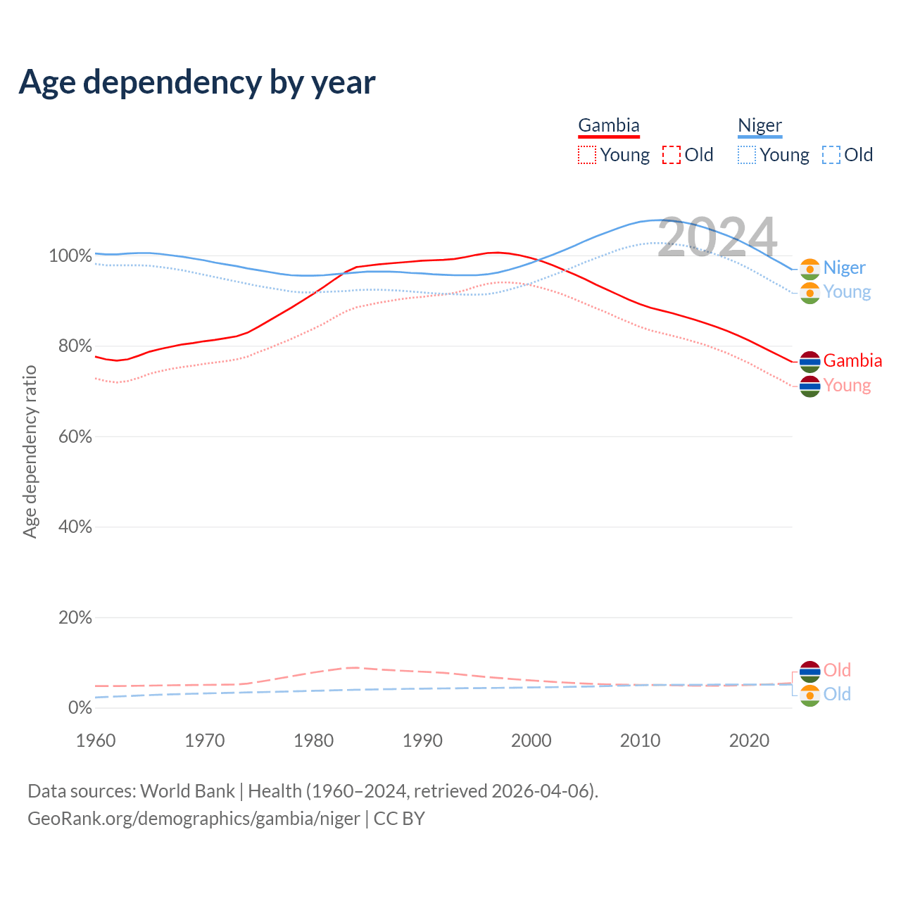 - The share of old-age demographic (65+) in the Gambia is 3.08% vs 2.59% in Niger.