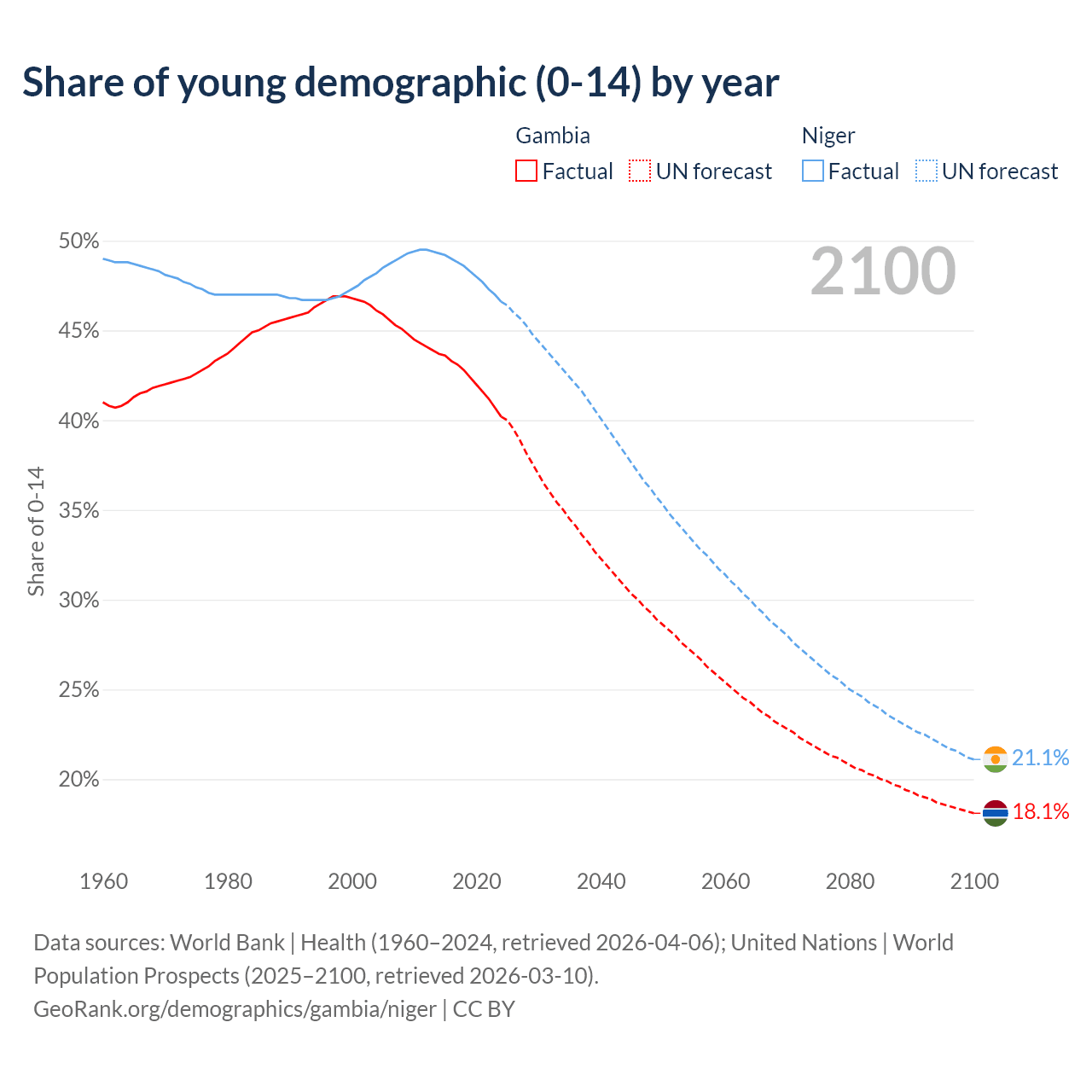 - The share of young demographic (0-15 years old) in the Gambia is 40.2% vs 46.6% in Niger.