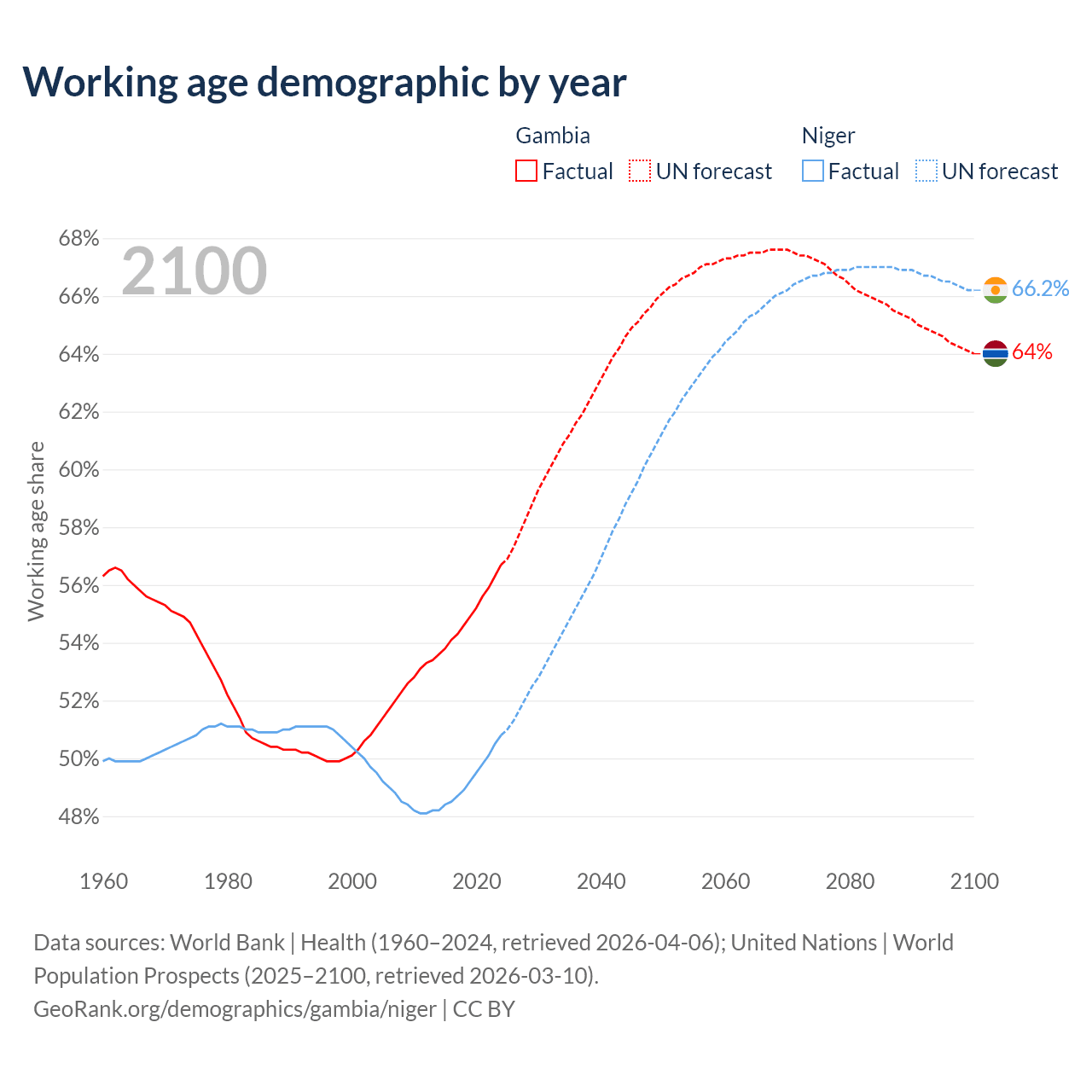 - The Gambia has 1.64M working age adults (aged 15-64) vs 14.8M in Niger.