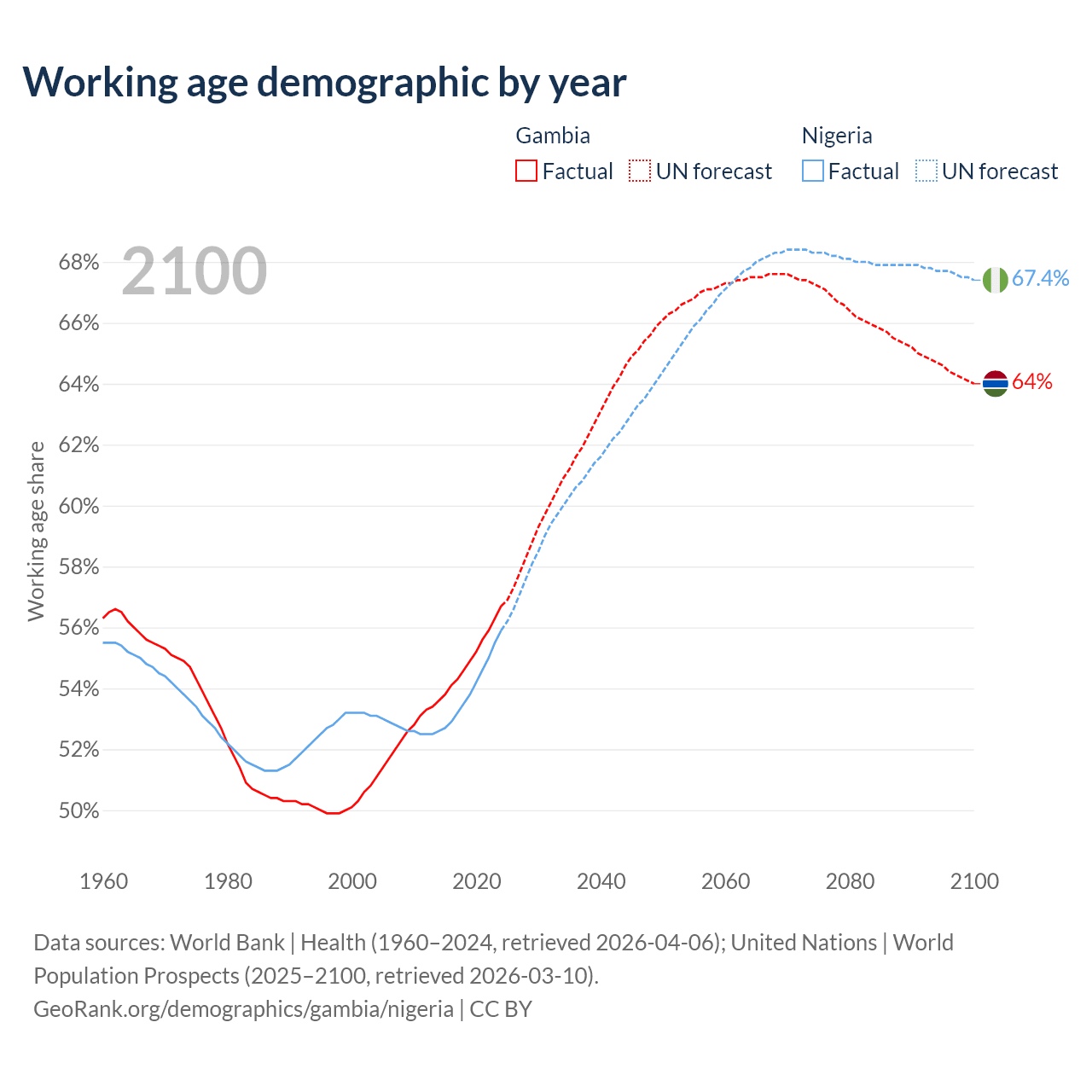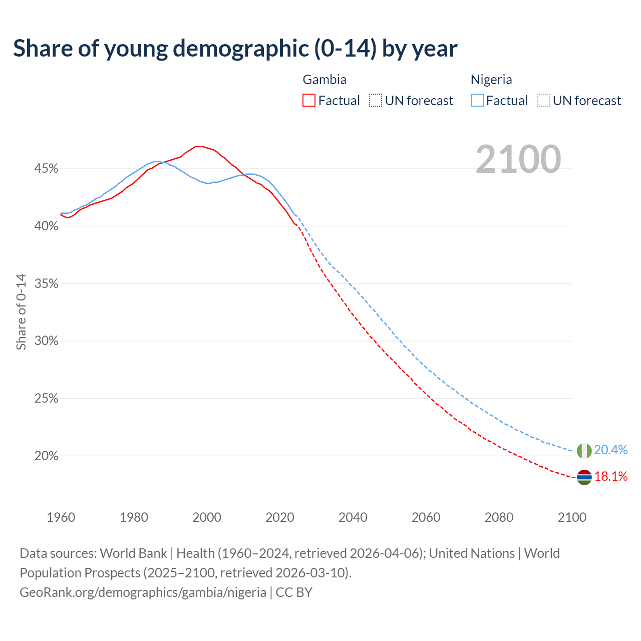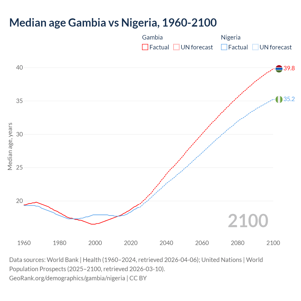 Median age Gambia vs Nigeria, 1960-2100