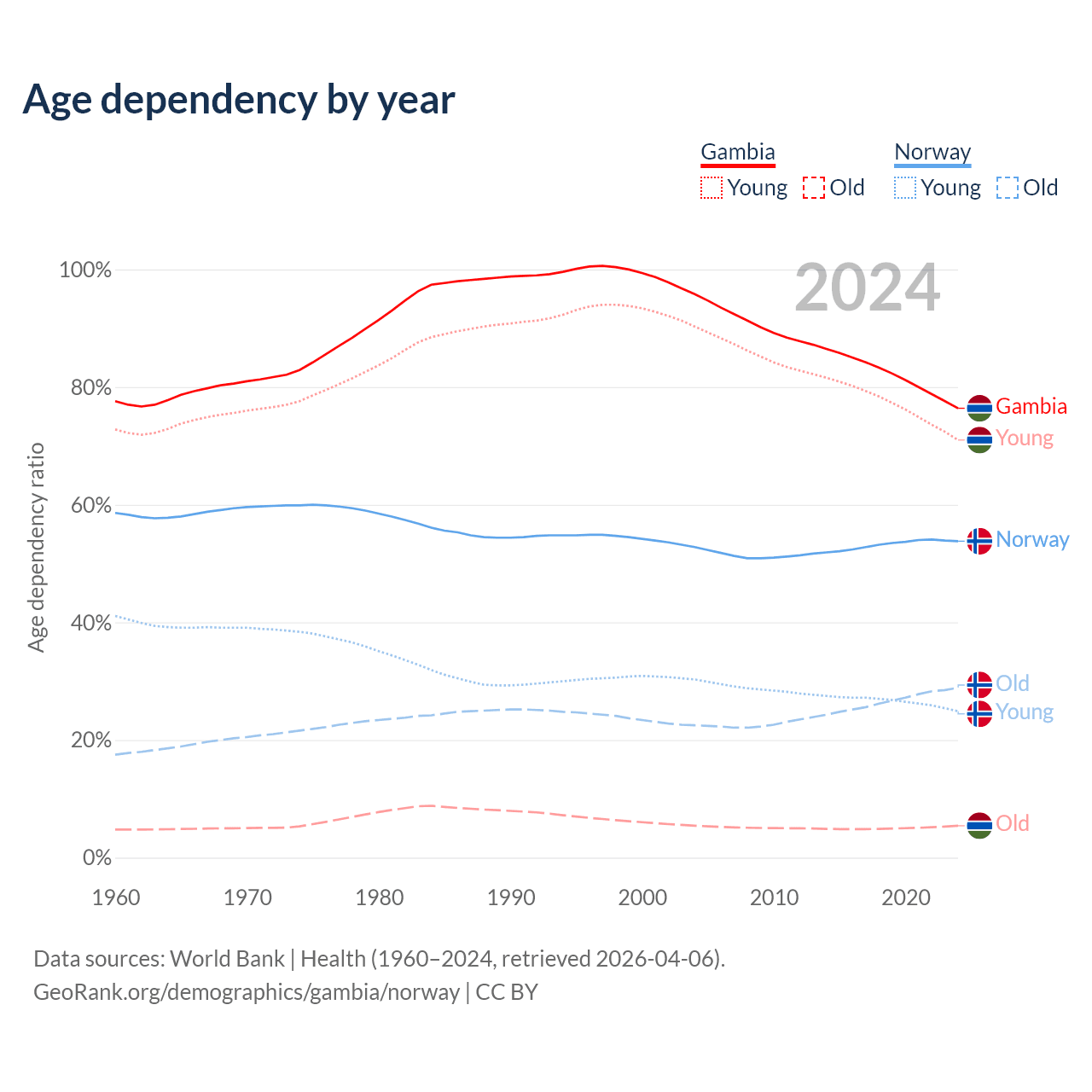 - The Gambia is ranked 171/196 by median age (oldest to youngest) vs 43/196 for Norway.