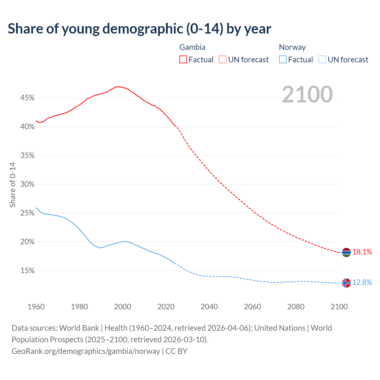 - The share of young demographic (0-15 years old) in the Gambia is 40.2% vs 16.2% in Norway.
