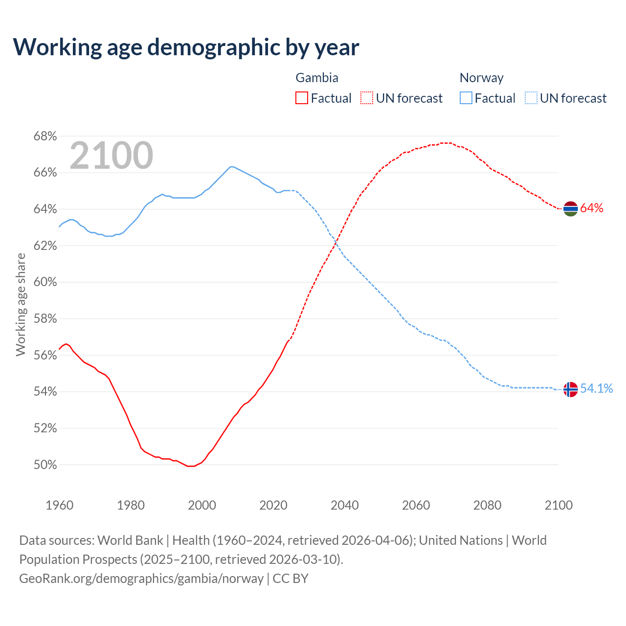 - The Gambia has 1.64M working age adults (aged 15-64) vs 3.69M in Norway.
