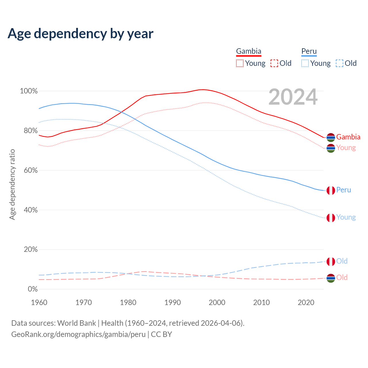 - The Gambia is ranked 171/196 by median age (oldest to youngest) vs 97/196 for Peru.