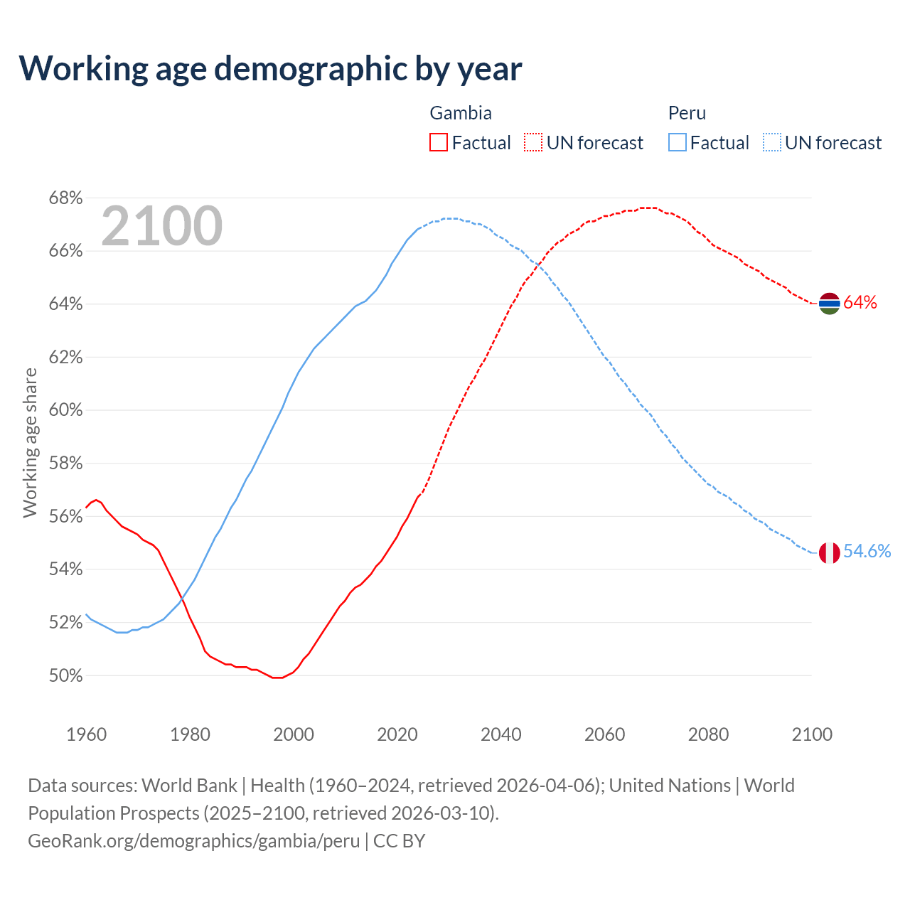 - The Gambia has 1.64M working age adults (aged 15-64) vs 23.4M in Peru.