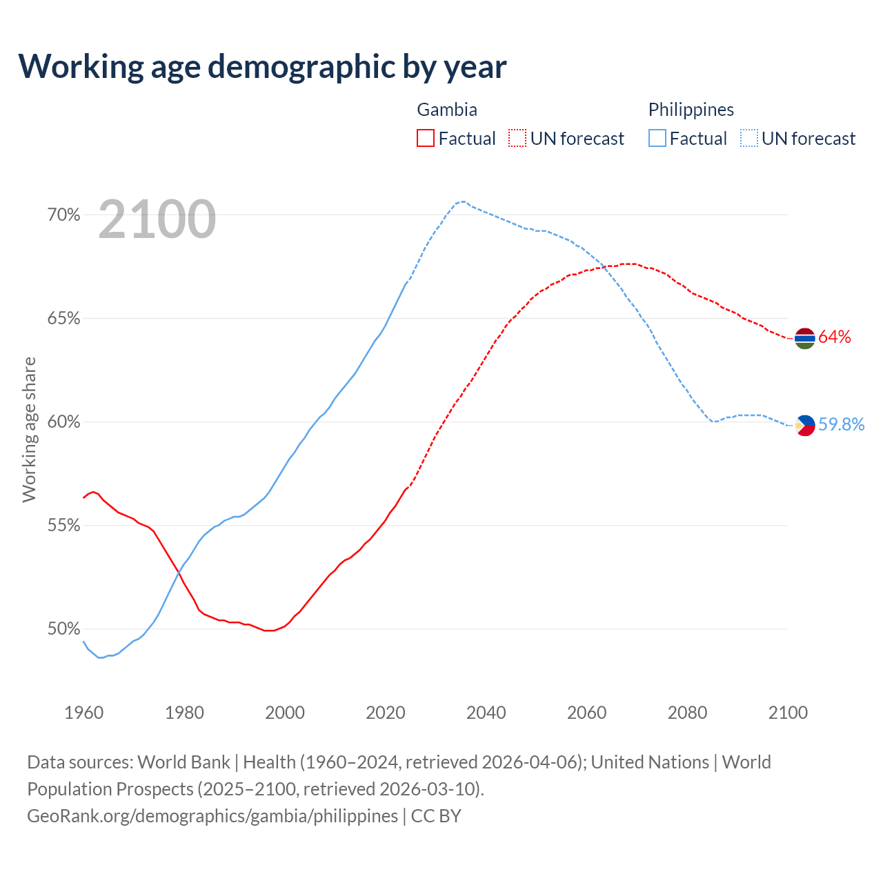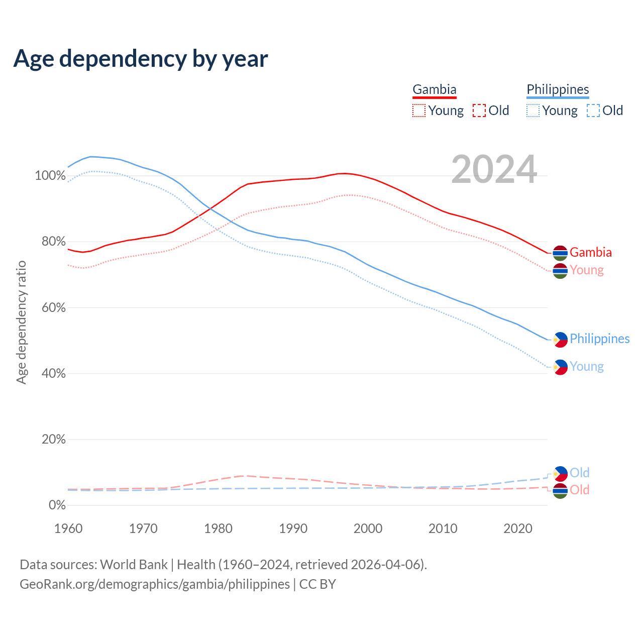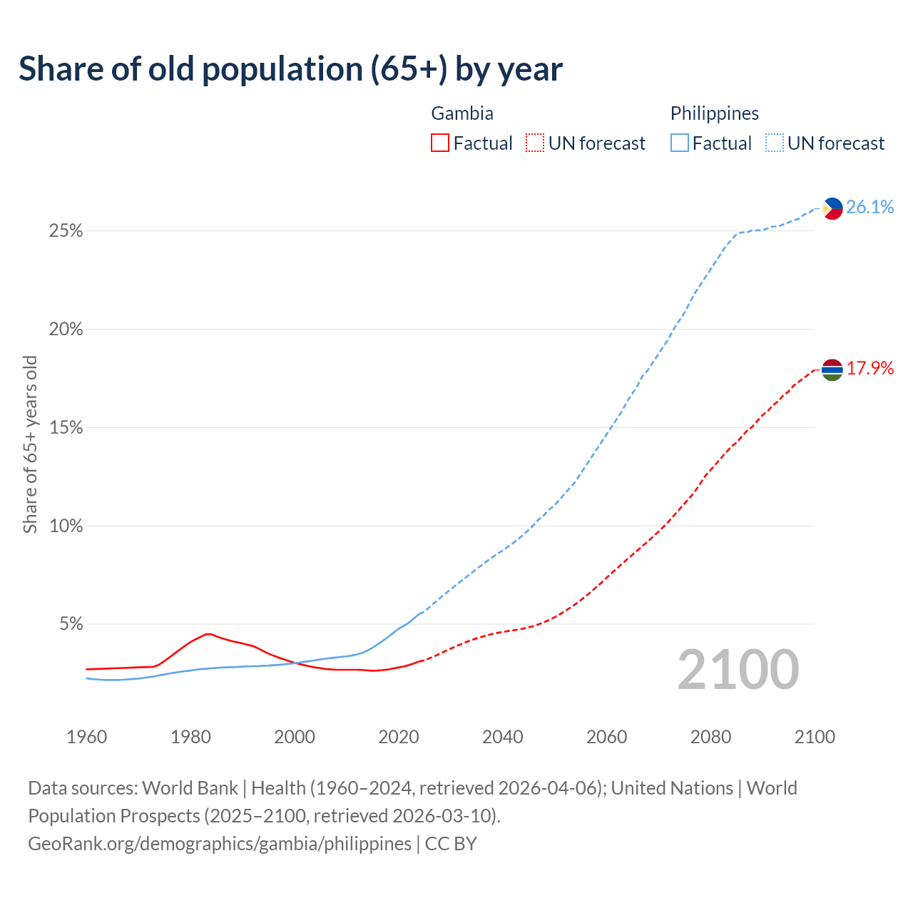 The share of older people aged 65 and over is 3.08% in the Gambia and 5.49% in the Philippines. Life expectancy in the Gambia compared to the Philippines .